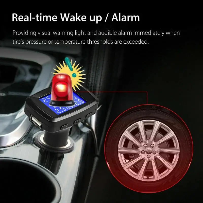 3. Пробуждение/будильник в режиме реального времени: визуальный предупреждающий светильник и звуковой сигнал сразу же, когда превышены пороги давления или температуры в шинах, поэтому можно принять корректирующие меры и продлить срок службы шин.