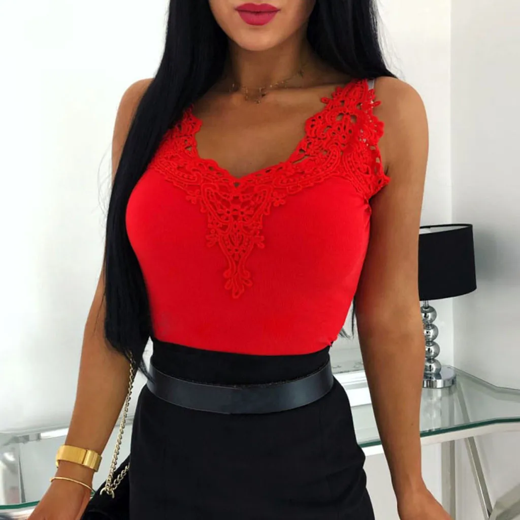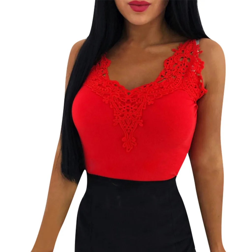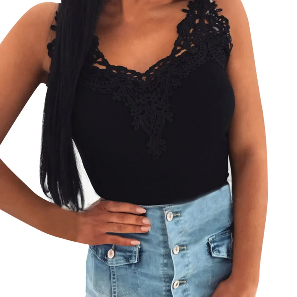 Women Casual Summer Sexy Lace Splice Sleeveless Solid Vest Blouse Tops Shirts