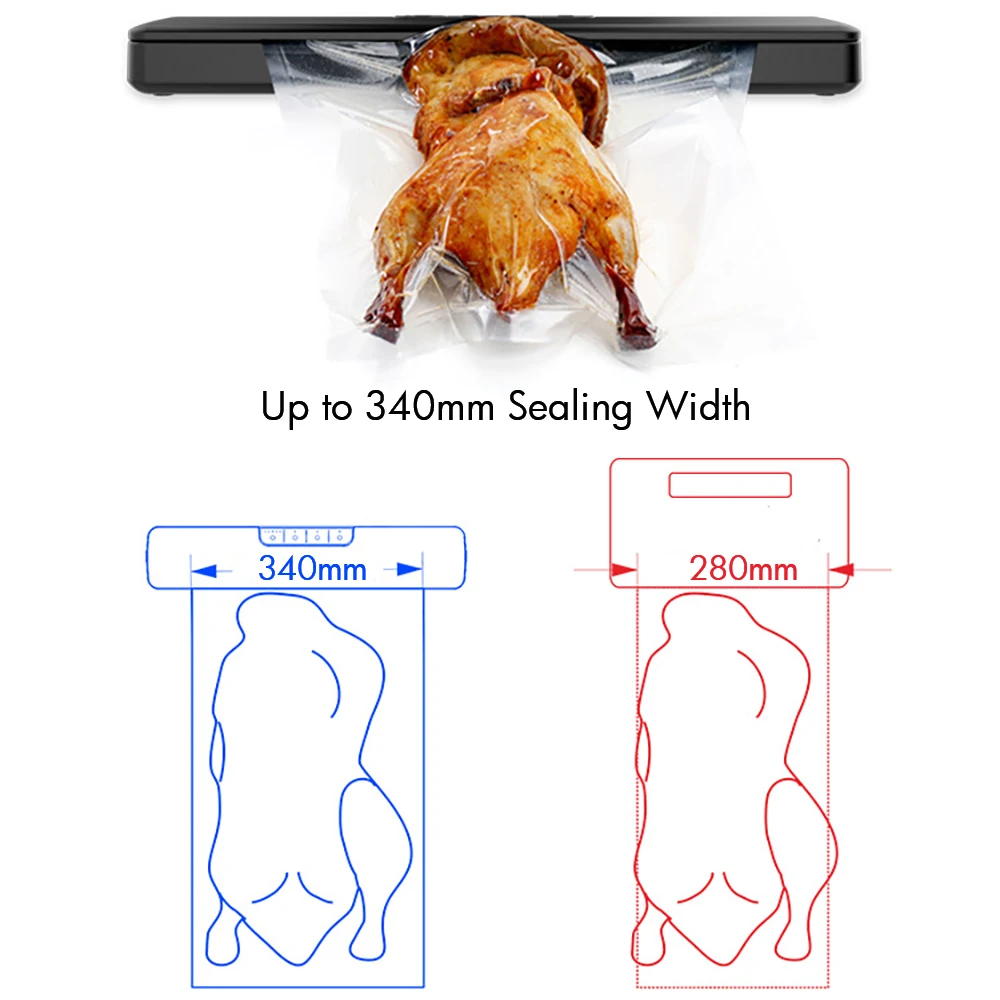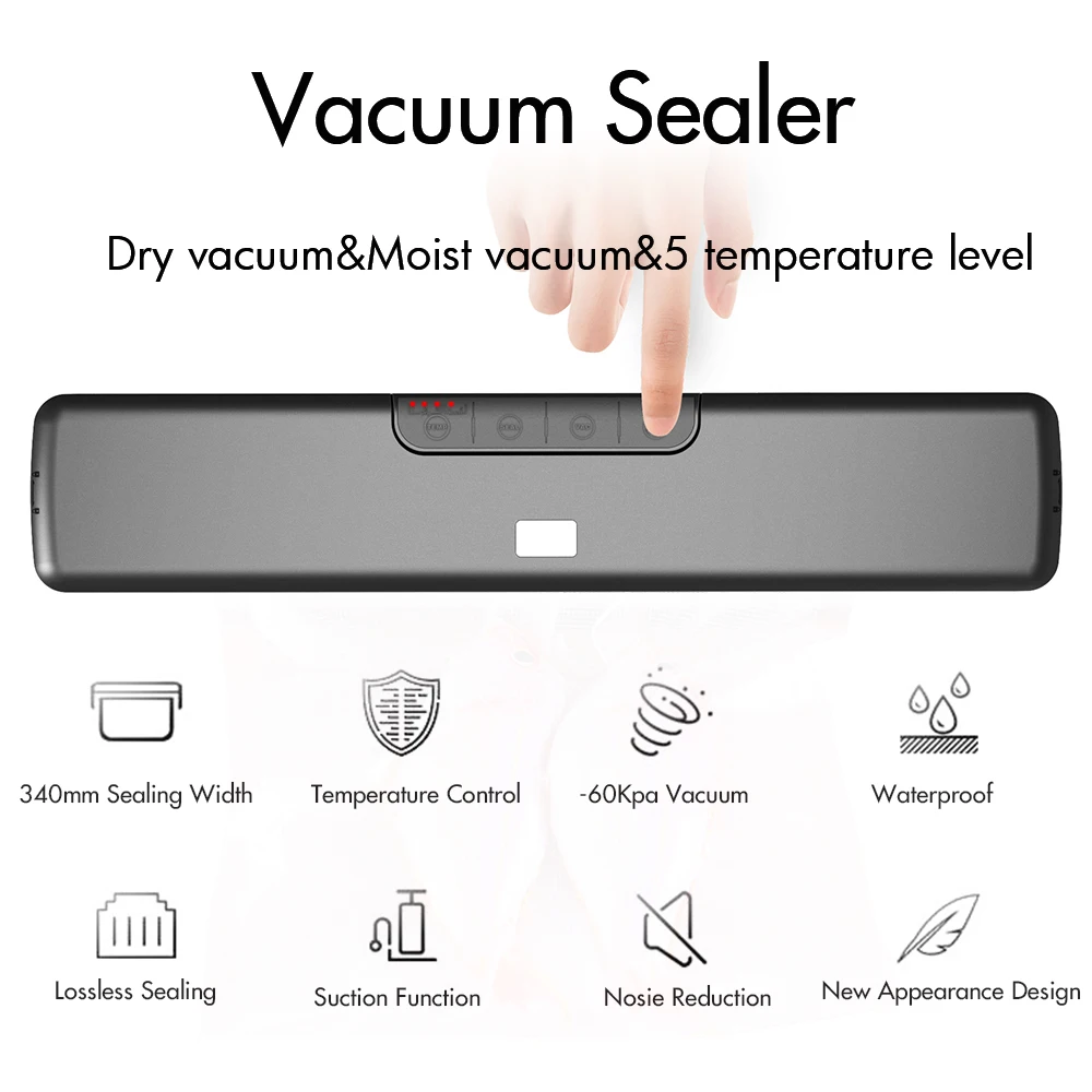 Функции: вакуум + герметизация, 5 температурных уровней, светодиодный индикатор, сухой + влажный вакуум, водонепроницаемая кнопка, 340 мм светодиодный индикатор