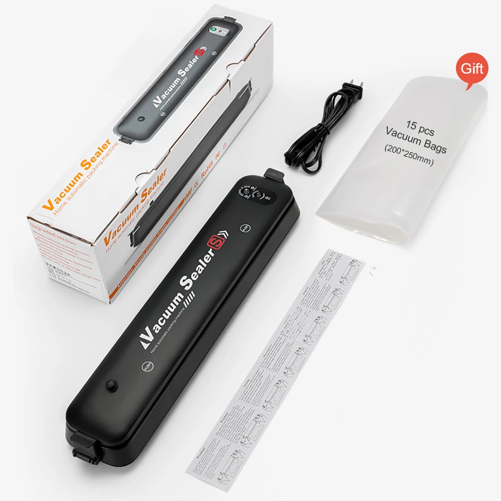 1*1 вакуумный упаковщик 15*1 вакуумные пакеты 1*1 разъем питания 1*1 руководство по эксплуатации (Языки: английский, французский, испанский, японский, немецкий, Италия)
