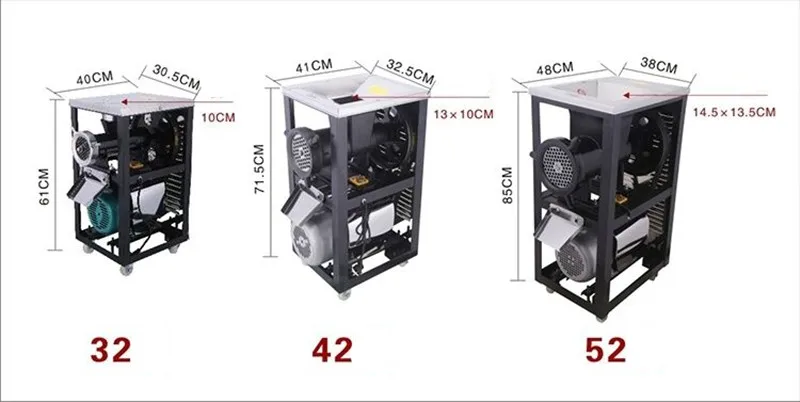 Модель: 32 Напряжение: 220V Двигатель Мощность: 2.2KW Производственная мощность: 150-180 кг/ч Ременный шкив: два Вес: 35 кг Модель: 42 Напряжение: 220V Двигатель Мощность: 3.0KW Производственная мощность: 200-230 кг/ч Ременный шкив: три Вес: 60 кг Модель: 52 Напряжение: 220V Двигатель Мощность: 3.5KW Производственная мощность: 400-500 кг/ч Ременный шкив: три Вес: 70 кг