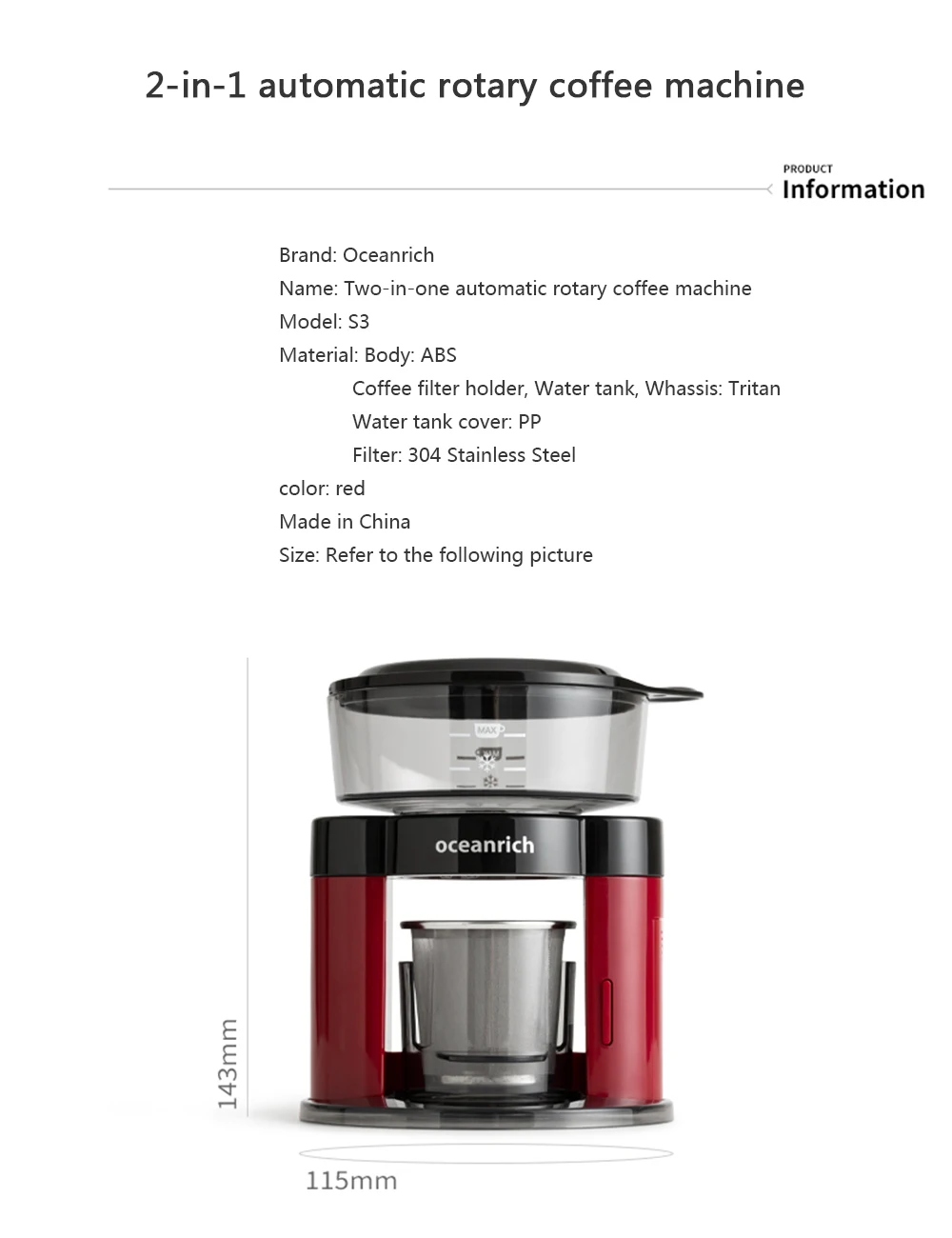 Бренд: oceanrich Название: 2-в-1 автоматический поворотный кофе машина Модель: S3 Материал: нержавеющая сталь, АБС, ПП Размеры: 14,3*11,5 см