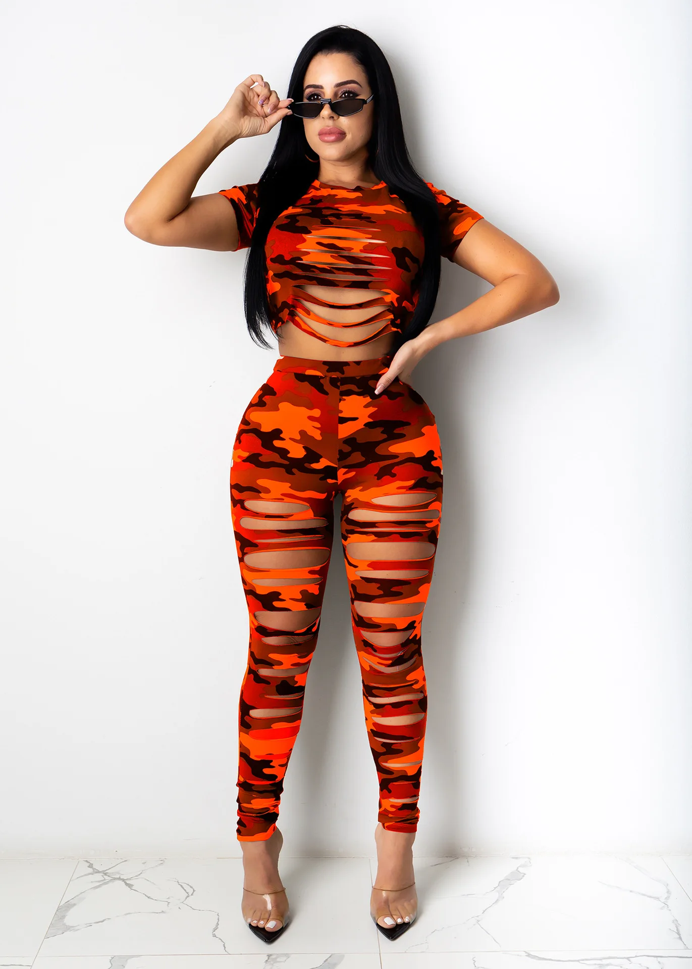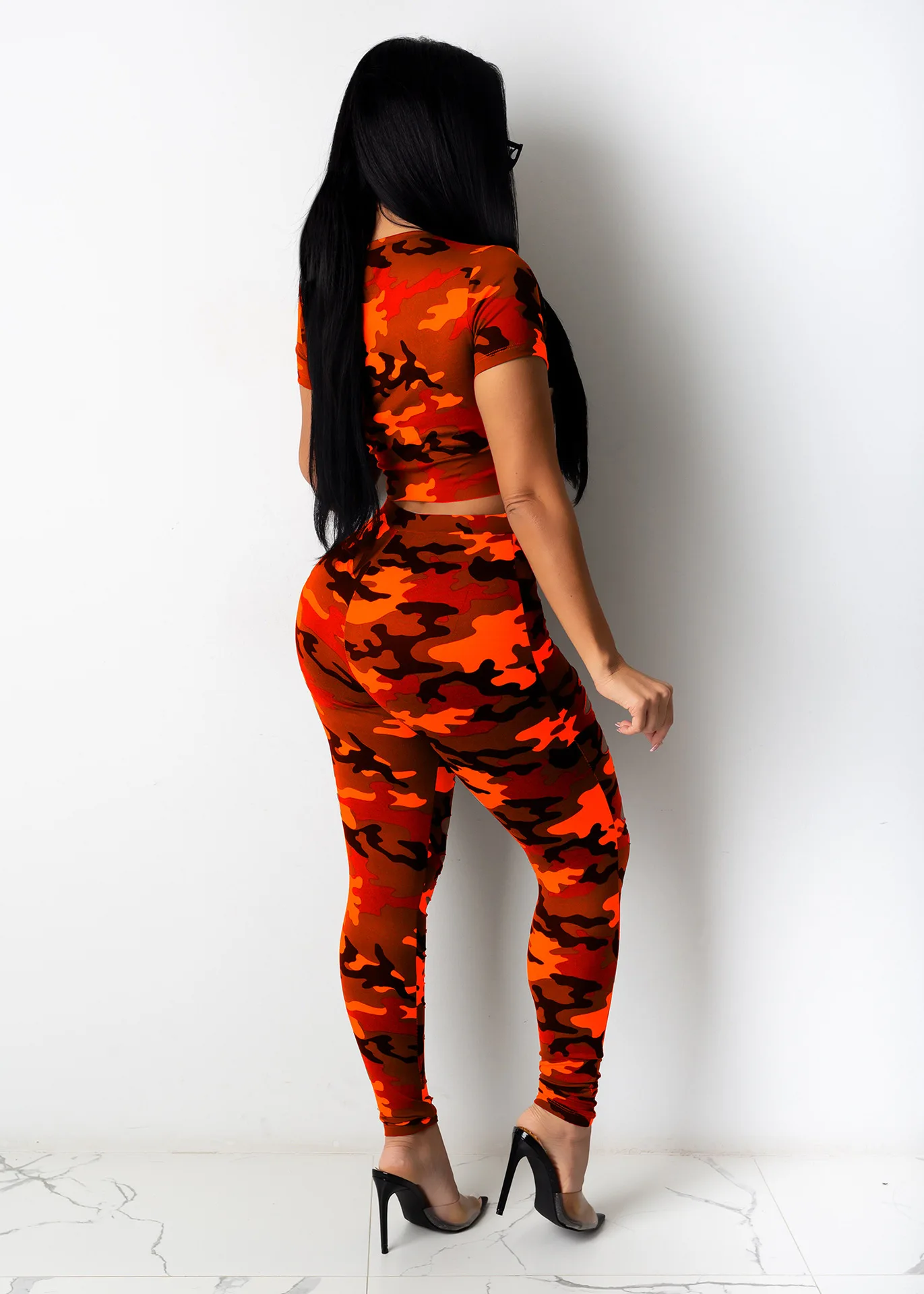 Оранжевый Камуфляжный комплект из двух предметов с дырками; Спортивный костюм с круглым вырезом и короткими рукавами; Укороченный топ; Узкие брюки; Модный костюм; Обтягивающие костюмы