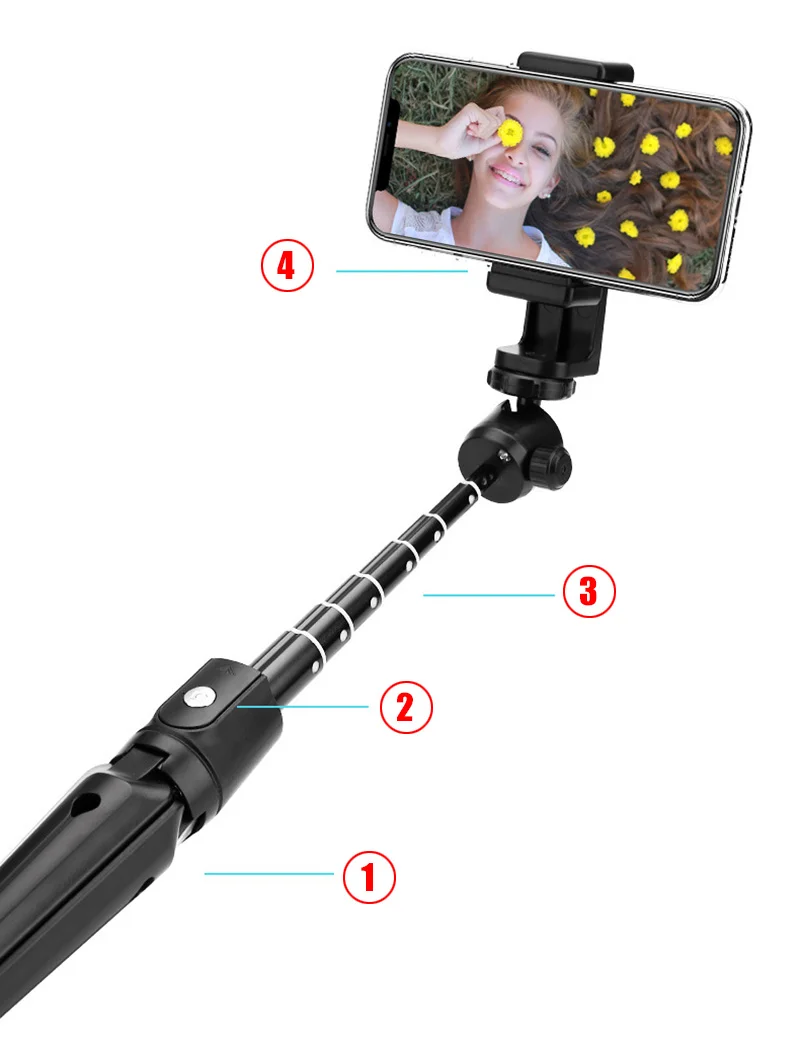 1 ABS пластиковая ручка; 2 с дистанционным управлением по Bluetooth; 3 ручки из алюминиевого сплава; 4 пластиковый зажим из АБС-пластика.
