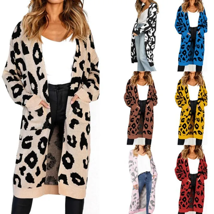 Женский Длинный свитер с открытой передней частью, кардиганы, модные повседневные свободные леопардовые вязаные пальто с длинным рукавом, осенняя верхняя одежда, джемпер цвета хаки, зеленый