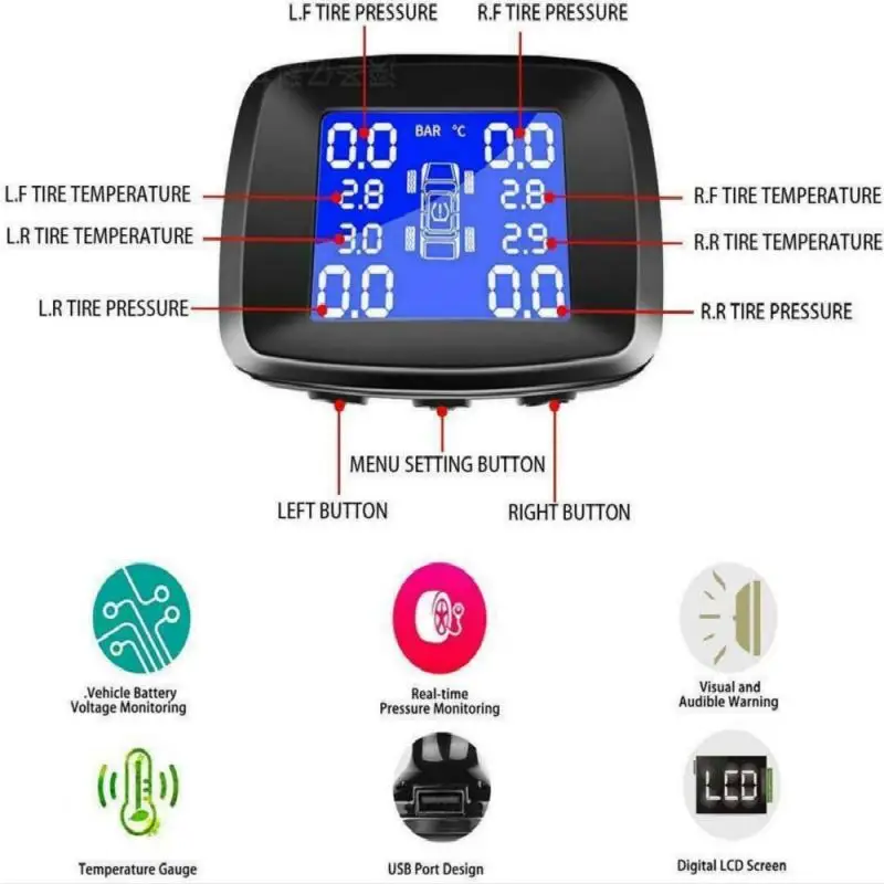 1. Digital Display: The tire pressure monitoring system allows you to monitor 4 tires by using an easy-to-see digital display. Easy to read from any angle day or night.