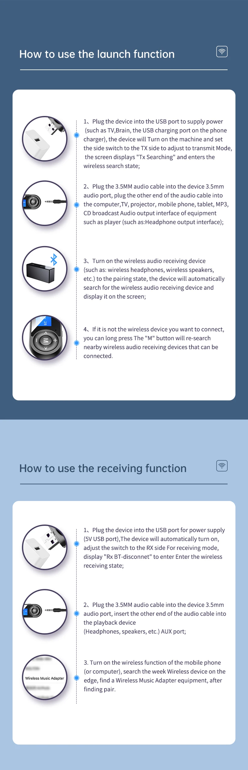 Поддерживаемые протоколы: V5.0 EDR,A2DP,HSP,AVRCP Приемный Рабочий ток: ≤ 43 мА Рабочий ток передачи: ≤ 60 мА Расстояние Bluetooth: 10 м (пустое место) Подключение режима TX: 3,5 мм стерео интерфейс/USB стерео интерфейс Подключение режима RX: стерео интерфейс 3,5 мм Режим RX с микрофоном: Поддержка звонков Handfrees Совместимость: Телефоны и планшеты на базе Android, IOS и все аудиоустройства Bluetooth, аудиоустройства с аудиовходом
