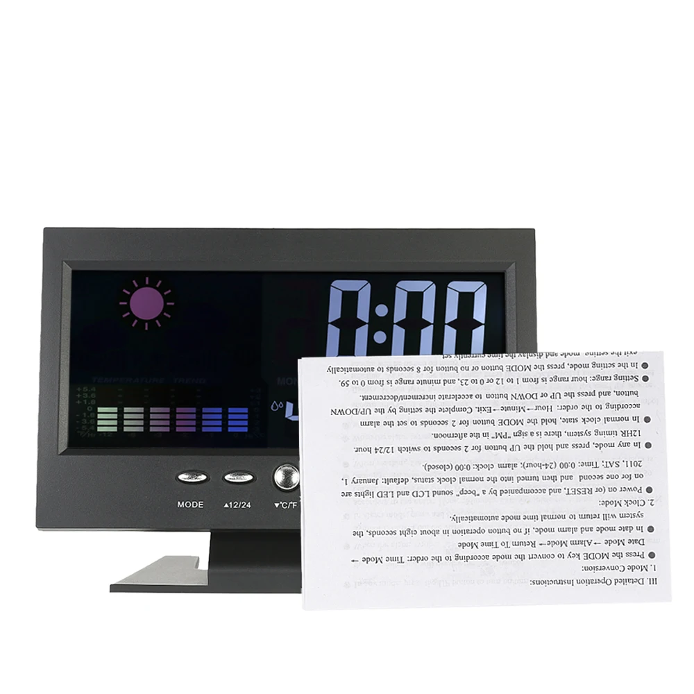 -Отображение времени, даты, недели и измерения температуры и влажности. -Отображение максимальной и минимальной температуры и влажности. -Прогноз погоды: солнечный, частично солнечный, облачный, дождливый и дождливый. -°C / °F единица измерения температуры опционально. -Отображение времени 12/24 часов опционально. -Цветной ЖК-дисплей с подсветкой. -Функция управления звуком: при сигнализации или издании звука загорается светодиод. -Функция подсветильник ки: светильник ка автоматически загорается в темноте через «ON S/C OFF». -Он также имеет функции будильника и повтора сигнала.