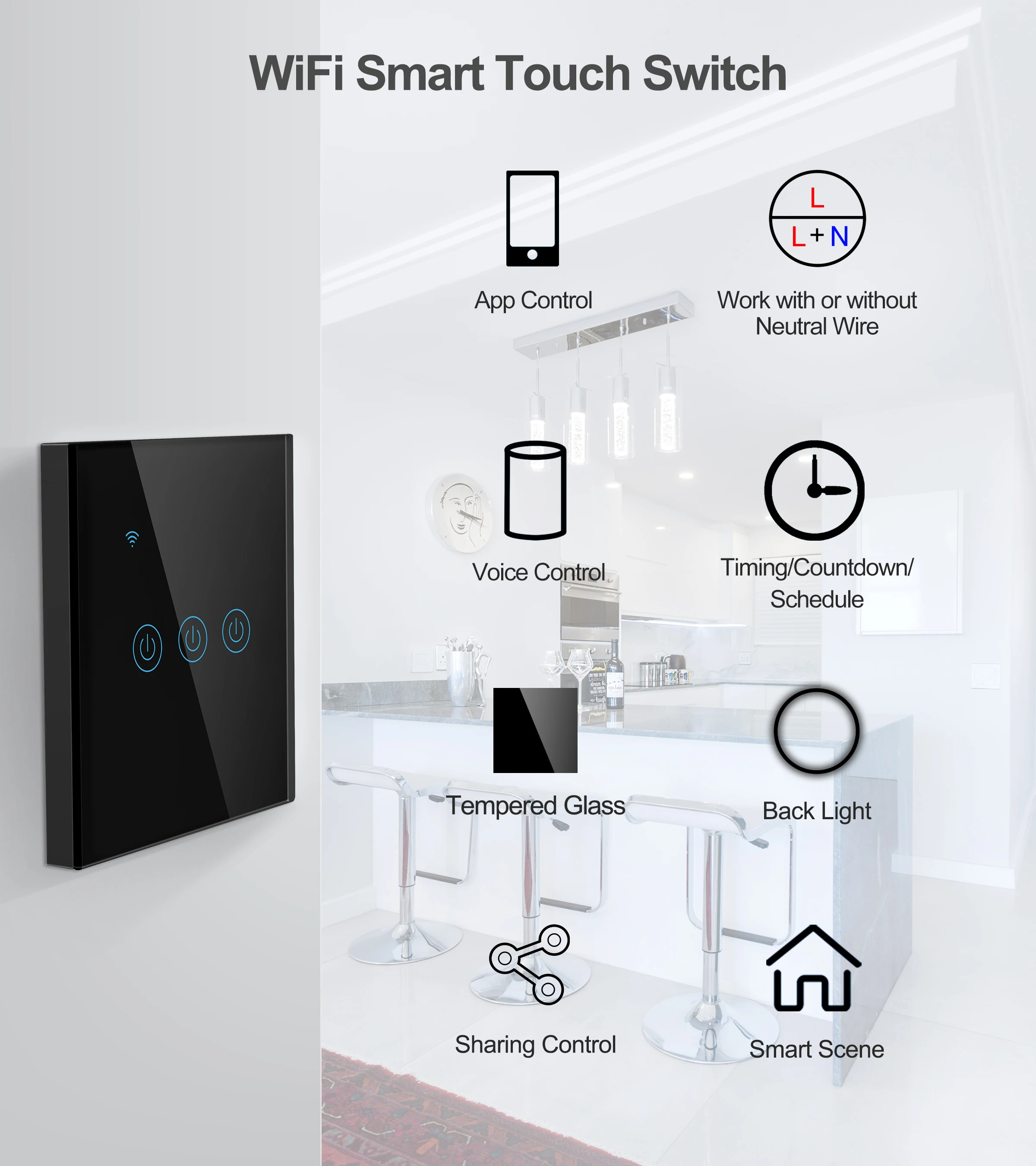Умный сенсорный выключатель Tuya с поддержкой Wi-Fi, ЕС, 220 В, работает с нейтральным проводным настенным светильник ключателем или без него, 1/2/3/4 кнопок, совместим с Alexa Google Home, концентратор не требуется