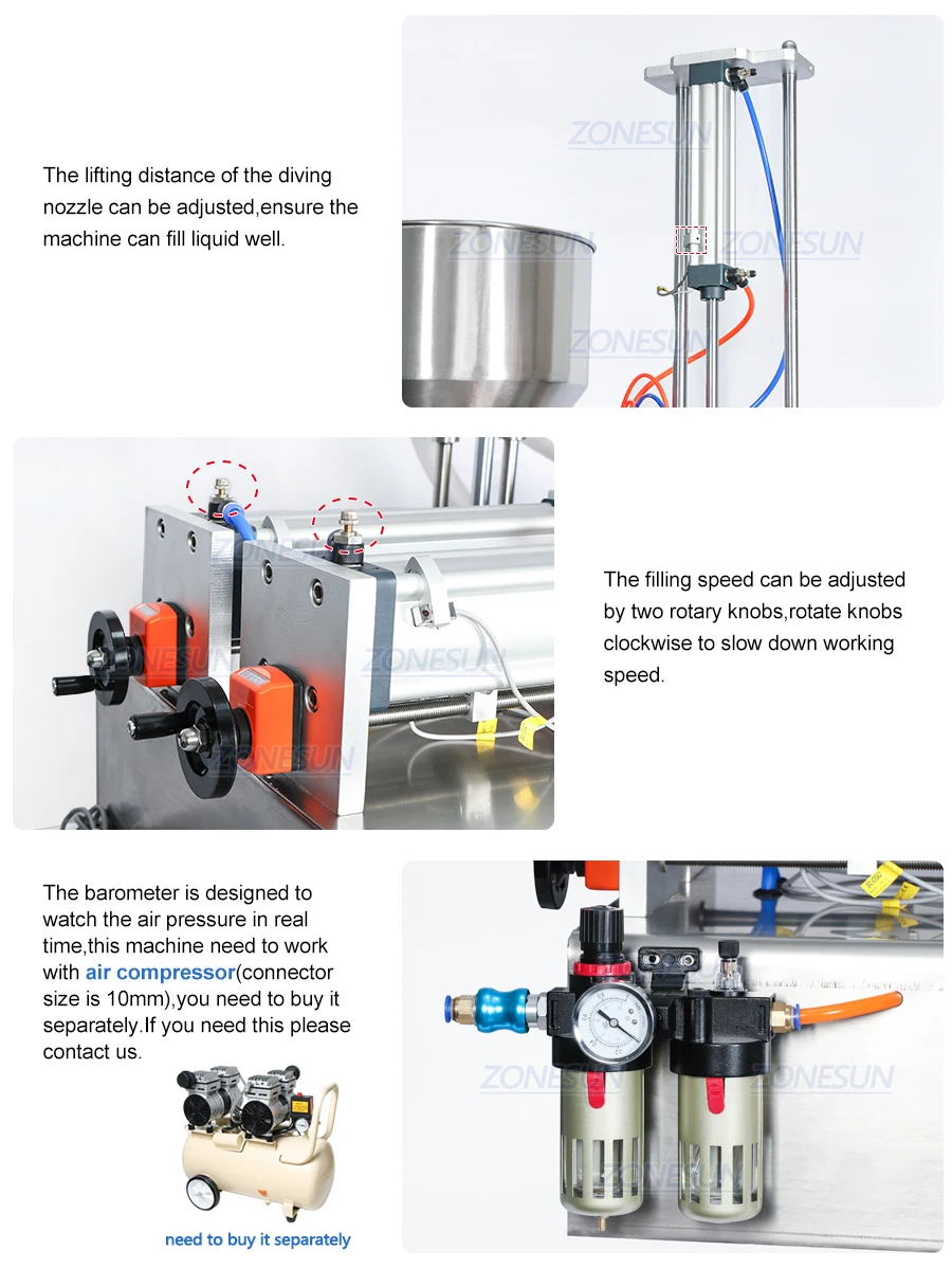 Эта пневматическая поршневая разливочная машина с 2 насадками для дайвинга, она автоматически поднимется во время работы, это подходит для наполнения пенопластовой жидкости, такой как мойка автомобиля, шампунь, мытье тела, мыло для рук и т. д. Скорость наполнения и объем наполнения можно регулировать в соответствии с производственными потребностями.