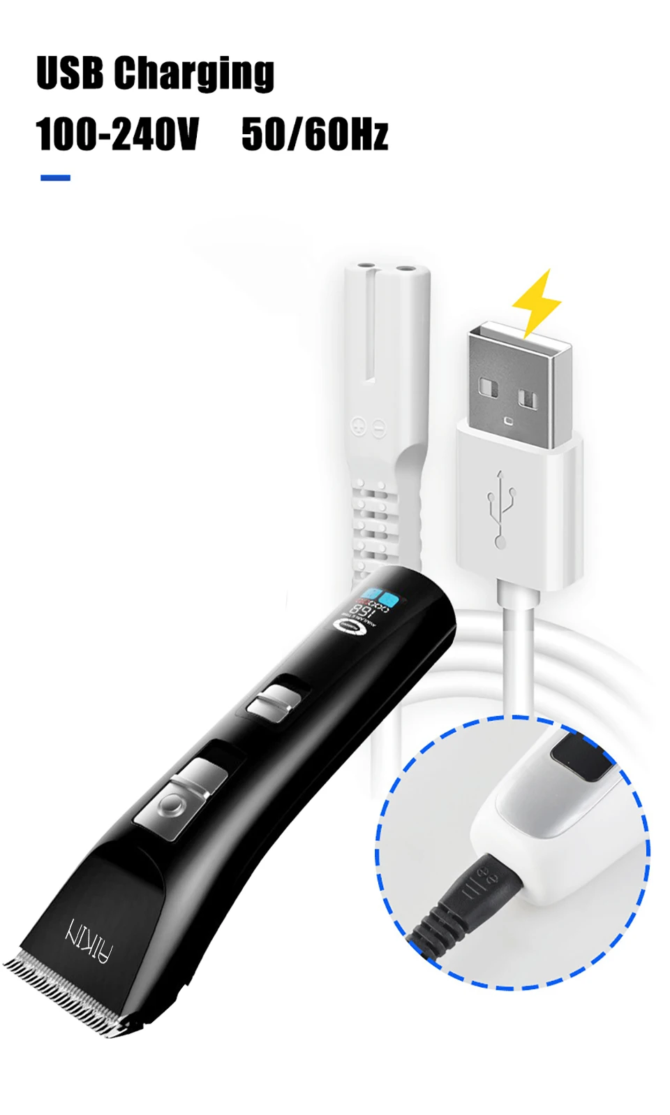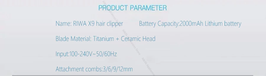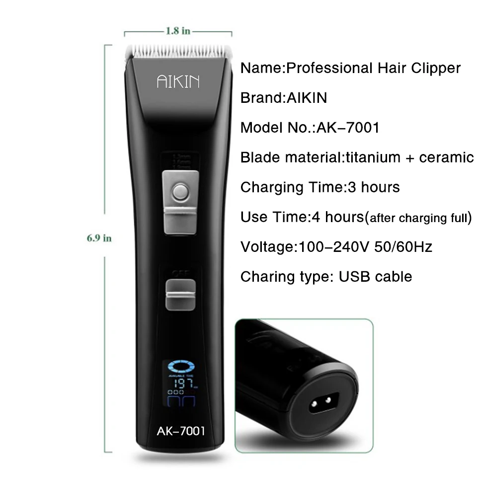 Бренд: AIKIN Номер модели: AK-7001 Цвет: черный Адаптер Вход Напряжение: 100V-240V ~ 50/60Hz Емкость аккумулятора: 2000 мАч Время зарядки: 3 часа Время использования: 240 минут после полной зарядки Размер: 170*45 мм