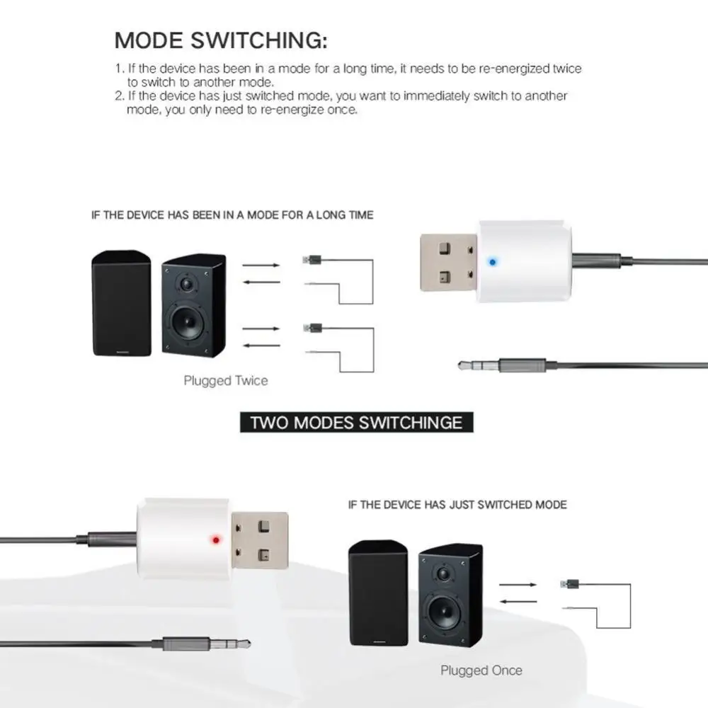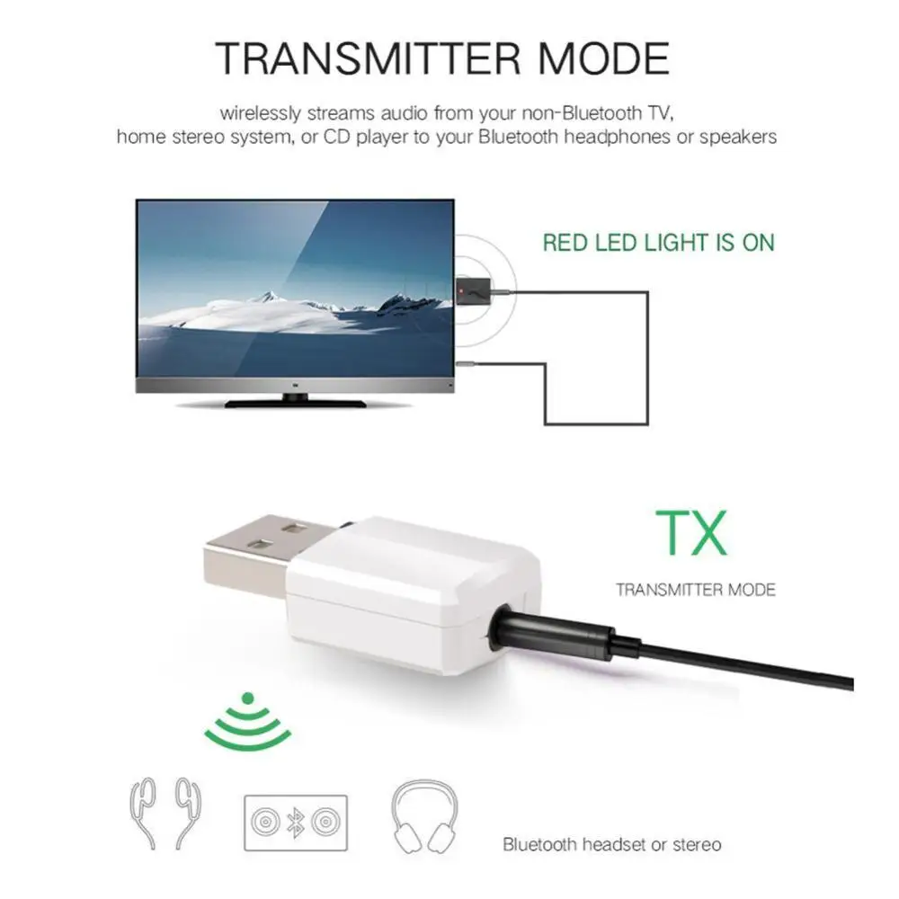 B) режим TX: режим TX будет автоматически искать другие устройства приема Bluetooth (такие как bluetooth-гарнитура, bluetooth-динамик, bluetooth-приемник и т. д.), Красный светильник мигает во время сопряжения, И Красный светильник перестанет мигать после завершения сопряжения. Подключите устройство к устройству, например, к телевизору с аудиокабелем 3,5/аудиокабелем RCA.