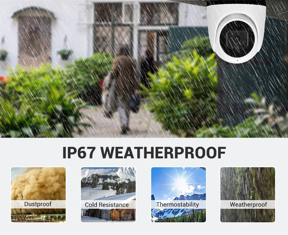 IP67-rated камера безопасности имеет прочный дизайн и прочную конструкцию, которая оценивается для общего использования на открытом воздухе. Пыленепроницаемость и устойчивость к атмосферным воздействиям.