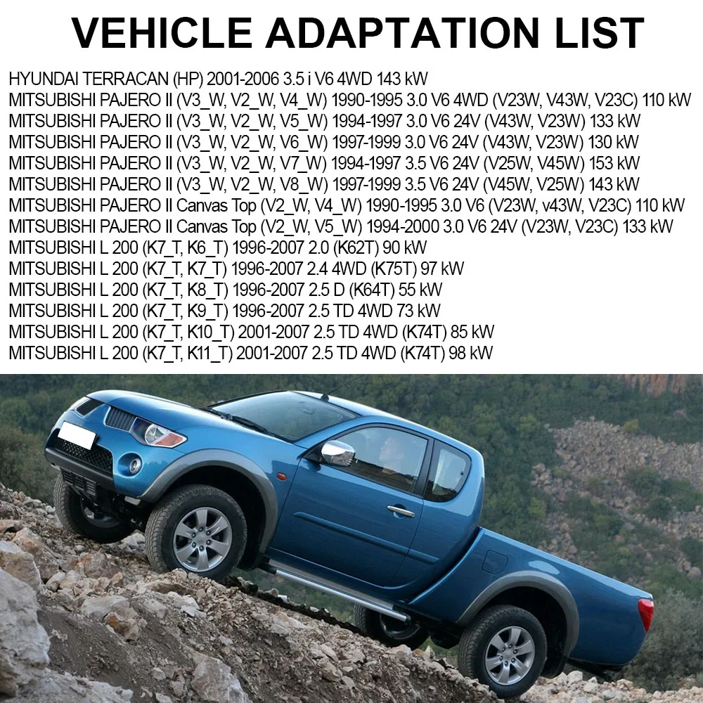 HYUNDAI TERRACAN (HP) 2001-2006 3,5 Я V6 4WD 143 КВт MITSUBISHI PAJERO II (V3_W, V2_W, V4_W) 1990-1995 3,0 V6 4WD (V23W, V43W, V23C) 110 КВт MITSUBISHI PAJERO II (V3_W, V2_W, V5_W) 1994-1997 3,0 V6 24V (V43W, V23W) 133 КВт MITSUBISHI PAJERO II (V3_W, V2_W, V6_W) 1997-1999 3,0 V6 24V (V43W, V23W) 130 КВт MITSUBISHI PAJERO II (V3_W, V2_W, V7_W) 1994-1997 3,5 V6 24V (V25W, V45W) 153 КВт MITSUBISHI PAJERO II (V3_W, V2_W, V8_W) 1997-1999 3,5 V6 24V (V45W, V25W) 143 КВт MITSUBISHI PAJERO II Холст Топ (V2_W, V4_W) 1990-1995 3,0 V6 (V23W, V43W, V23C) 110 КВт MITSUBISHI PAJERO II Холст Топ (V2_W, V5_W) 1994-2000 3,0 V6 24V (V23W, V23C) 133 КВт MITSUBISHI L 200 (K7_T, K6_T) 1996-2007 2,0 (K62T) 90 КВт MITSUBISHI L 200 (K7_T, K7_T) 1996-2007 2,4 4WD (K75T) 97 КВт MITSUBISHI L 200 (K7_T, K8_T) 1996-2007 2,5 D (K64T) 55 КВт MITSUBISHI L 200 (K7_T, K9_T) 1996-2007 2,5 TD 4WD 73 КВт MITSUBISHI L 200 (K7_T, K10_T) 2001-2007 2,5 TD 4WD (K74T) 85 КВт MITSUBISHI L 200 (K7_T, K11_T) 2001-2007 2,5 TD 4WD (K74T) 98 КВт
