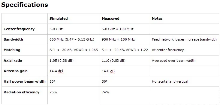 1. Хорошая эффективность излучения. Большинство FR4-based патчей имеют ужасную эффективность, потому что FR4 очень терпеливо на 5,8 ГГц.