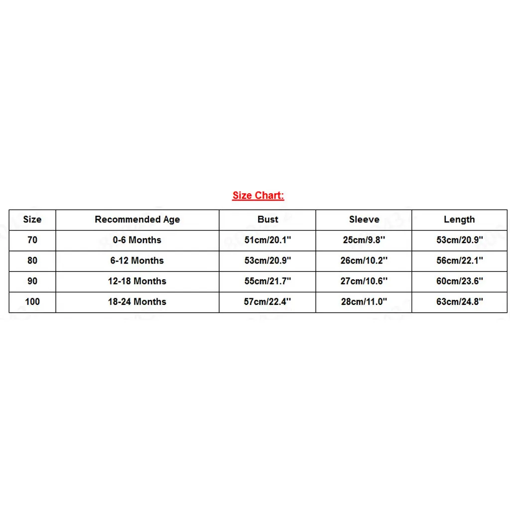 Размеры Рекомендуемый возраст Обхват груди Рукава Длина 70 Для детей от 0 до 6 месяцев 51 см/20,1" 25 см/9,8'' 53 см/20,9" 80 6-12 месяцев 53 см/20,9" 26 см/10,2'' 56 см/22,1" 90 12-18 месяцев 55 см/21,7" 27 см/10,6'' 60 см/23,6" 100 18-24 месяцев 57 см/22,4'' 28 см/11,0" 63 см/24,8"