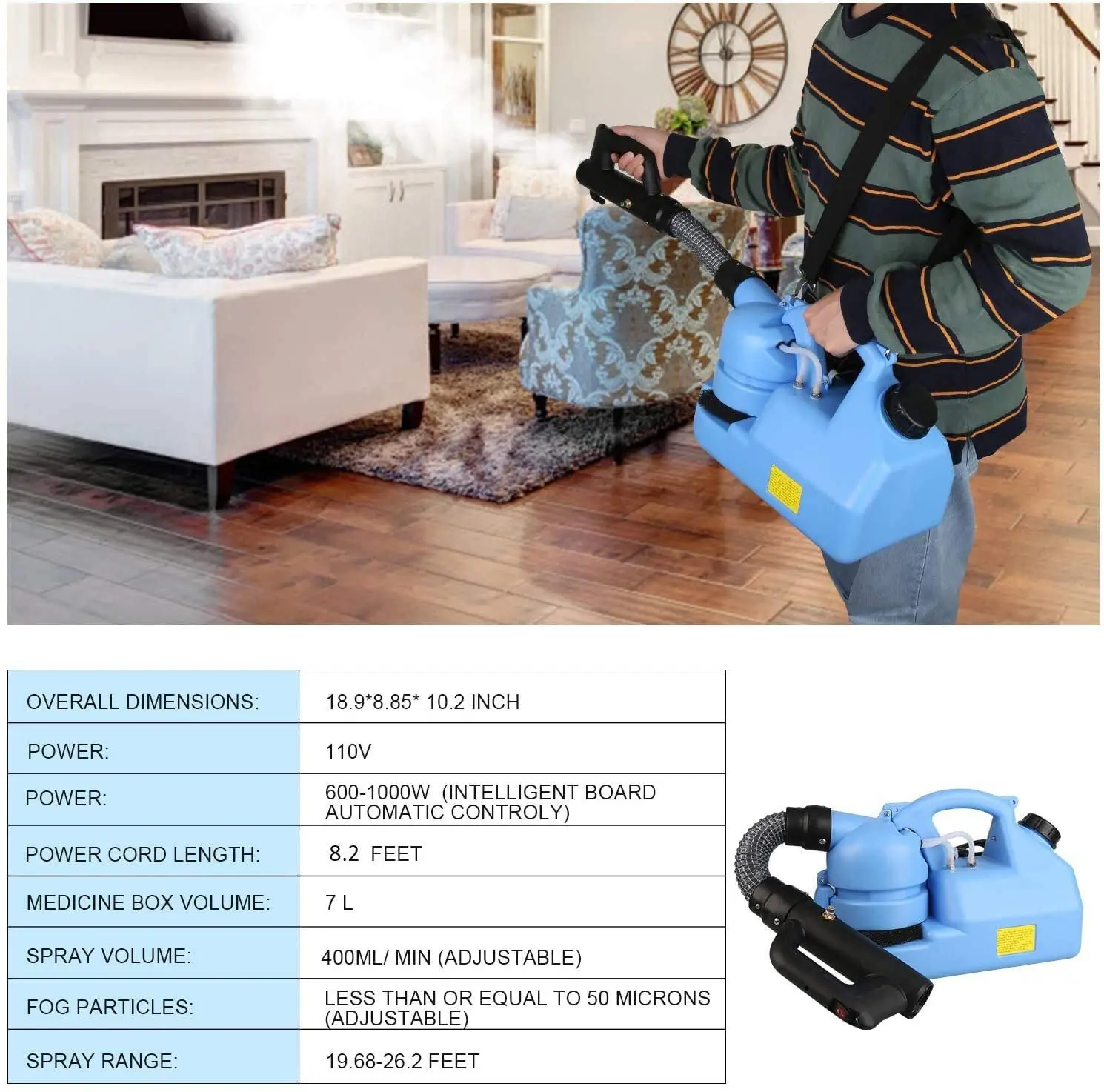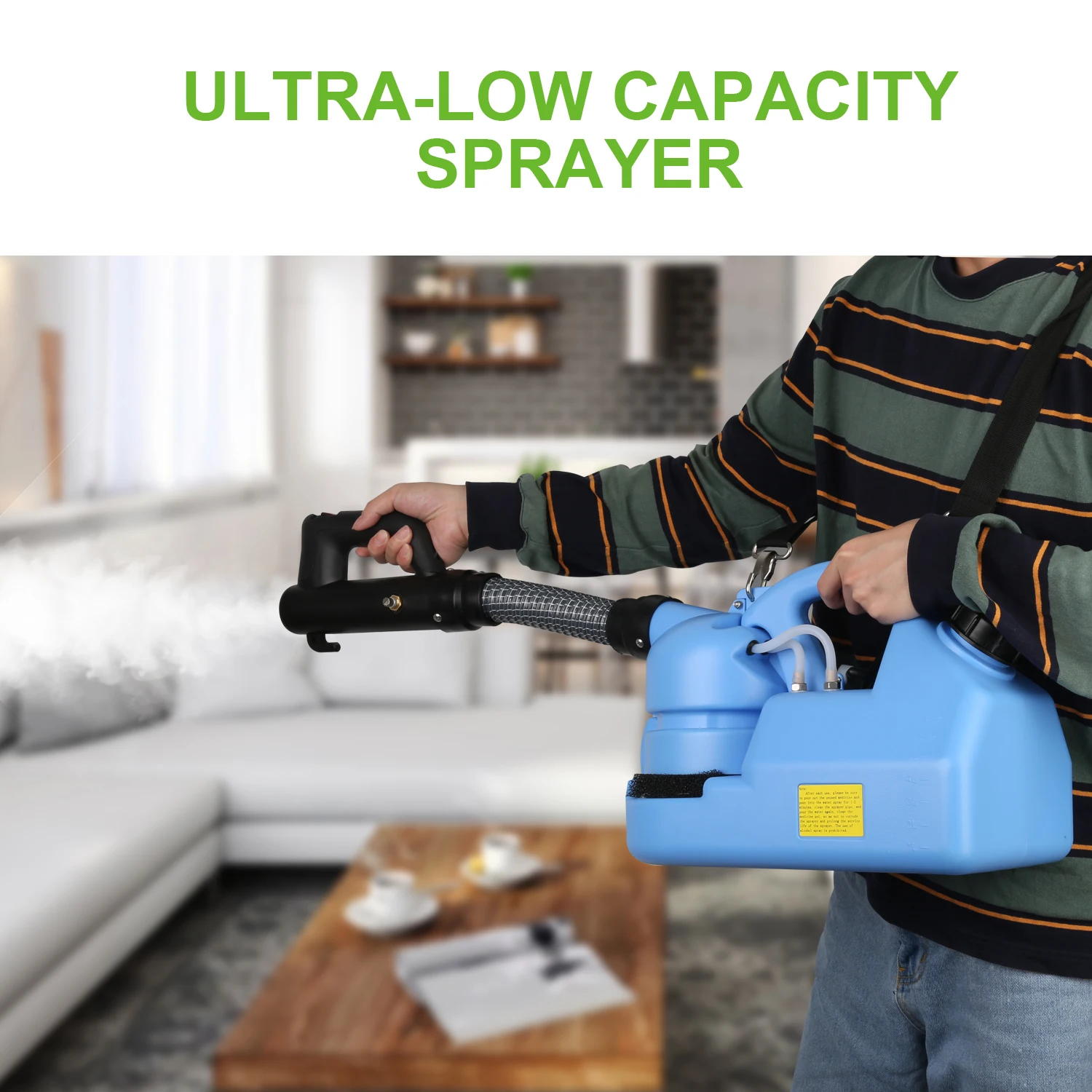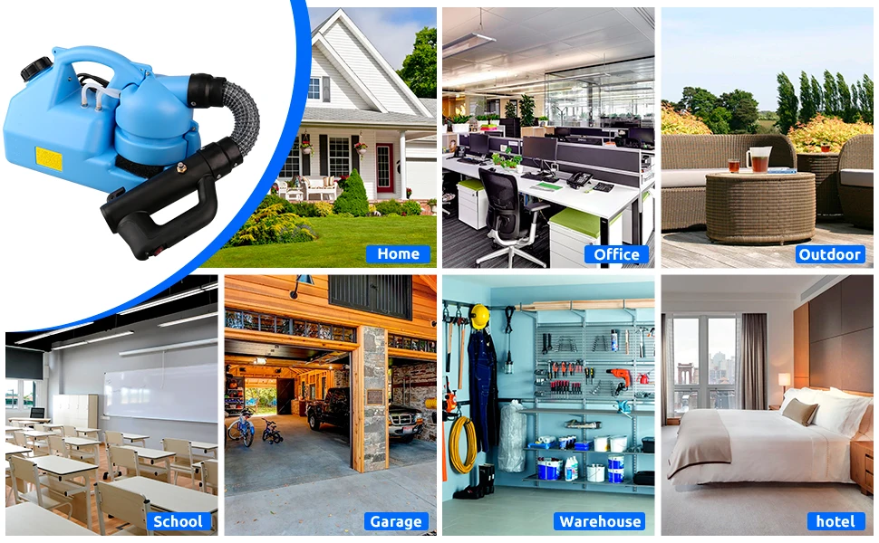 Наш Fogger питается от 1200 Вт 110VAC электрического двигателя достижения. Расширенный Шнур питания делает диапазон дезинфекции больше и дезинфекция более тщательной. Всегда носите защиту рук и глаз при эксплуатации электрического ULV Fogger.