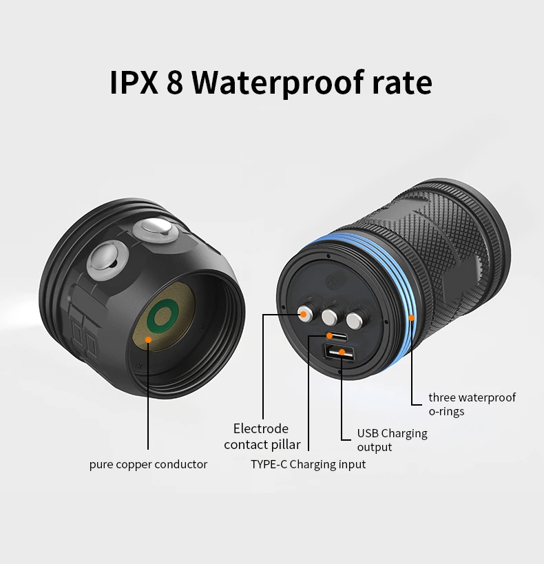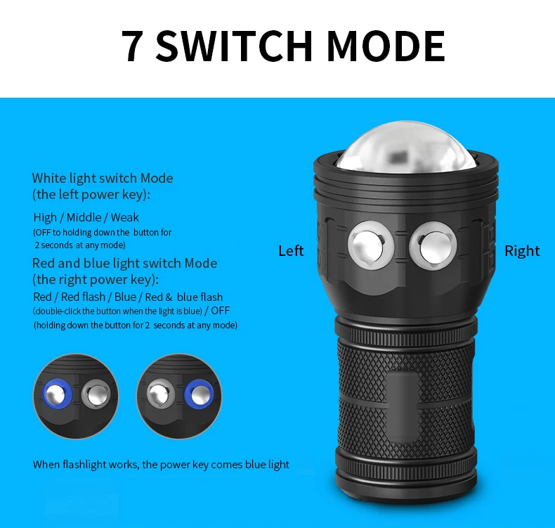 Номер модели: многофункциональный светильник для дайвинга, светильник для вспышки Светильник: шарик COB Белый светильник (левая клавиша питания): высокий/средний/слабый (выключено, чтобы долго нажимать кнопку в течение 2 секунд для любого режима) Красный и синий светильник (правая клавиша питания): красная/красная медленная вспышка/синяя/красная быстрая вспышка (дважды нажмите кнопку в любом режиме)/Выкл (удерживайте кнопку в течение 2 секунд в любом режиме) Свойства стекла: двойное покрытие 6 мм и стекло из закаленного поликарбоната. Светильник чашки: Нет светильник чашки Материал изделия: алюминиевый сплав Белый светильник Цветовая температура: 6000K Красный светильник, Цветовая температура: 620 нм Синий светильник Цветовая температура: 455 нм Угол луча: 120 Водонепроницаемый скорость передачи данных: IPX8 Мощность продукта: 500 Вт Тип переключателя: кнопка включения лампы Поверхность: трехступенчатое твердое Анодное окисление. Расстояние облучения: 300-500 метров Источник питания: четыре аккумулятора 18650 (не входят в комплект) Рабочее напряжение: 3,7 V Цвет изделия: черный Вес нетто: 479 г Глубина погружения: 80 м под поверхностью Размер: 122 мм (длина), 65 мм (диаметр головки), 55 мм (диаметр конца) Примечание: этот фонарик для дайвинга очень мощный. Не используйте его в течение длительного времени дома (не может превышать 5 секунд), в противном случае это приведет к перегреву и повреждению фонарика.
