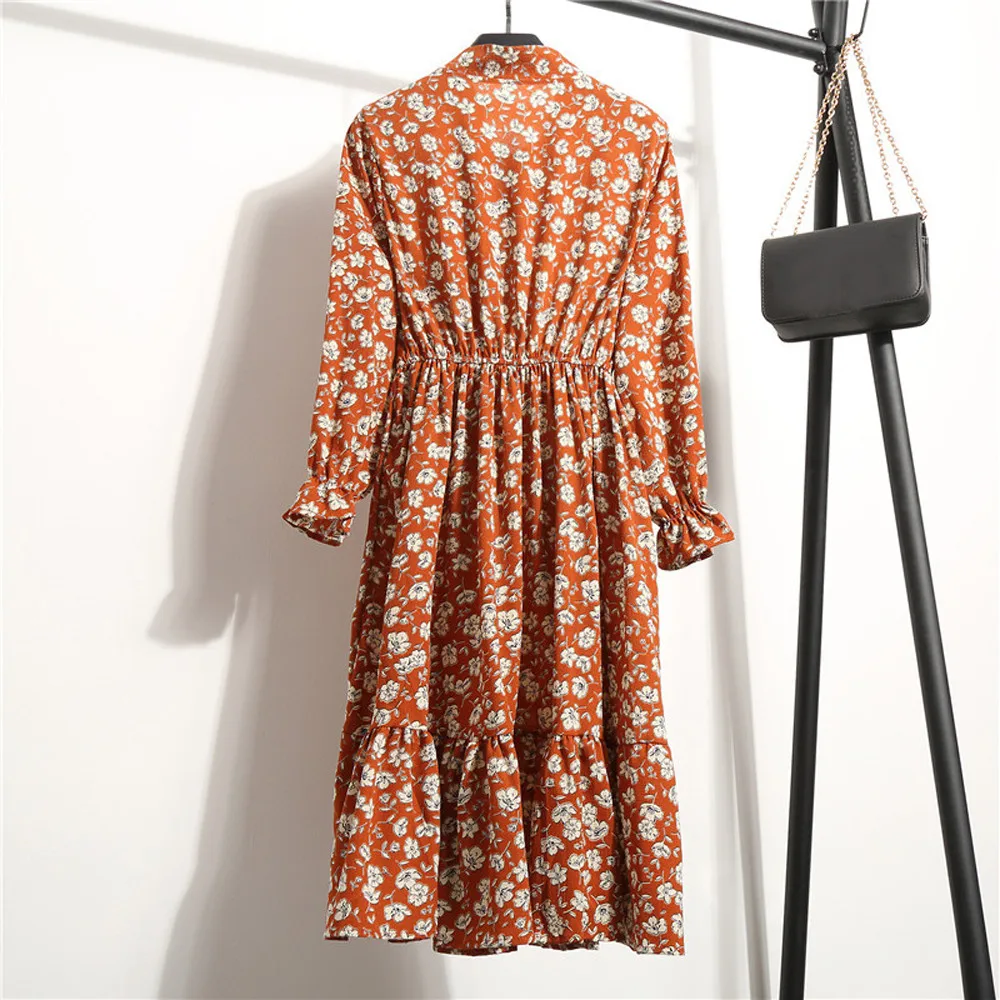 Вам понравится это милое платье на осенних каникулах. Это платье с длинными рукавами и воротником-стойкой с цветочным принтом для привлекательного образа. Вы можете сочетать с босоножками на блочном каблуке или туфлями без задника.