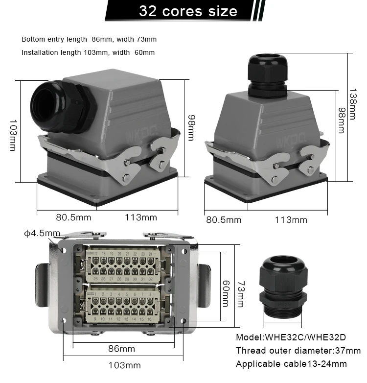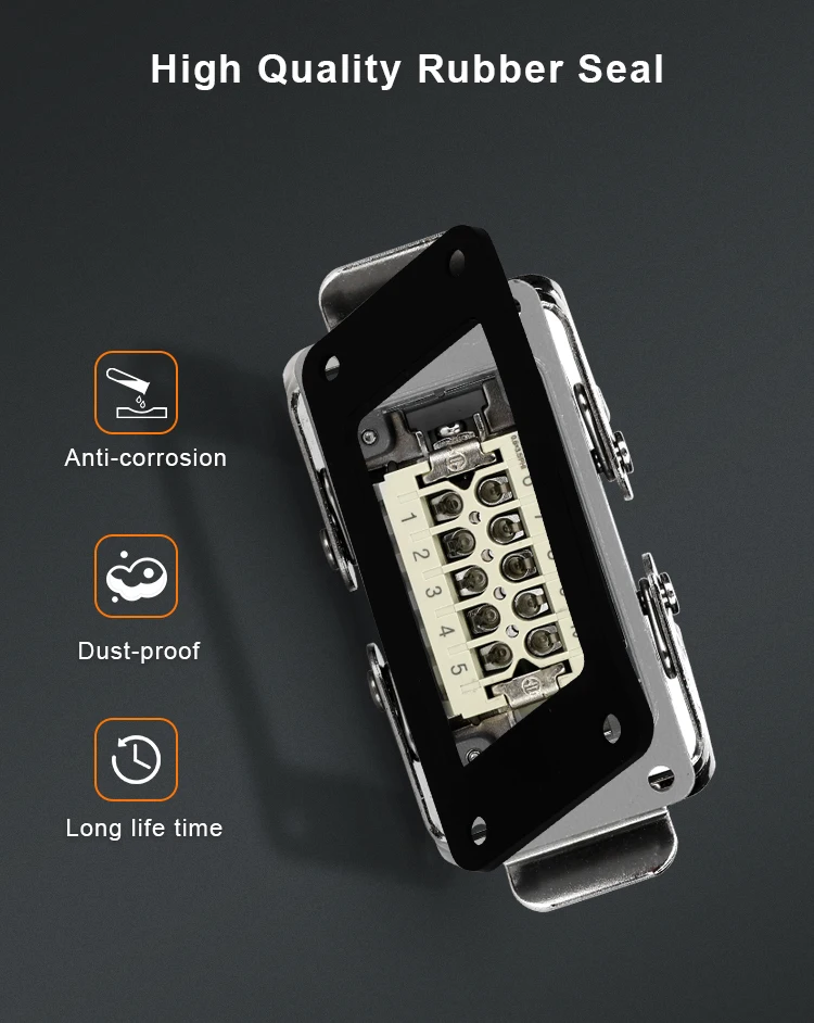 Каждый сверхмощный разъем питания включает в себя вставку для мужчин и женщин, винтовые контакты, боковую или верхнюю крышку входа, переборочный корпус и кабельный сальник.