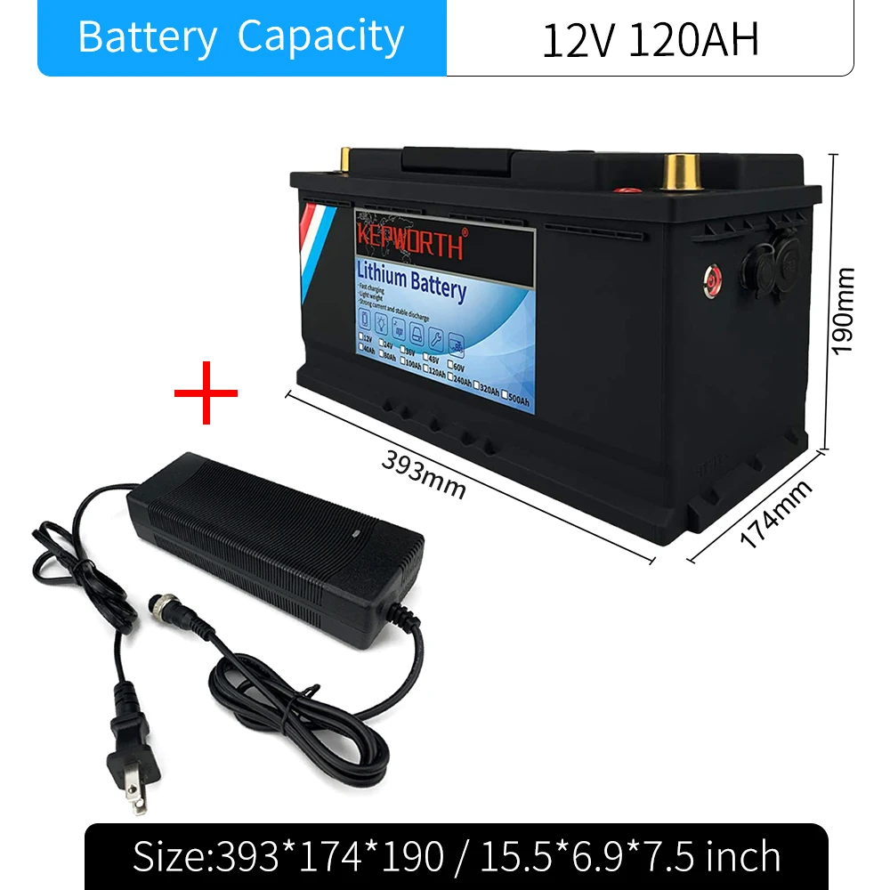 KEPWORTH LiFePO4 батарея для хранения энергии 12V 120Ah литий-железо-фосфатных аккумуляторов и Батарея многократного цикла глубокого заряда-разряда LiFePO4 батареи Встроенный BMS жизнь более чем 3000 CyclesFor RV Кемпер гольф-кары внедорожные гератора солнечной энергии и хранение энергии ветра Об этом товаре:Емкость: 120 АчМатериал батареи:Литий-железо фосфат (LiFePO4) батареяНоминальное напряжение: 12,8 VНоминальное напряжение: 12 ВМаксимальное напряжение защиты: 14,6 вКонечное напряжение: 10 вМгновенный ток разряда:≥ 240AТок непрерывного разряда:≥120АРазмер:393*174*190 ммВес: 13 кгСертификат: CE ROHS MSDS UN38.3Высококачественные детали/аксессуары: класс АПлата защиты напряжения (BMS): ДаСрок службы: 2000 циклов-100% 6000 циклов-70%Максимальный ток зарядки: 50AРабочийТемпература: -20 ~ 60 ℃Температура зарядки: 0-45℃
