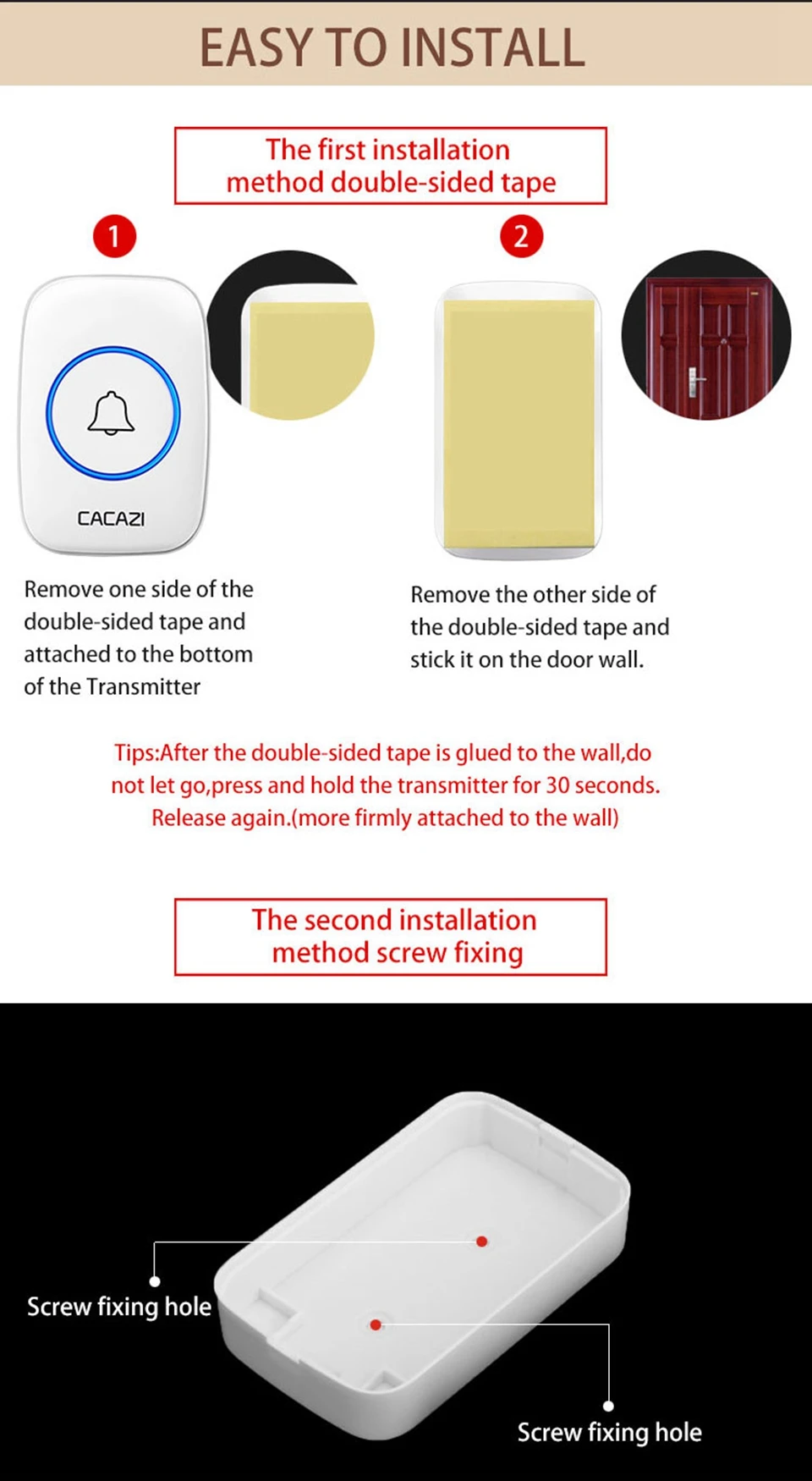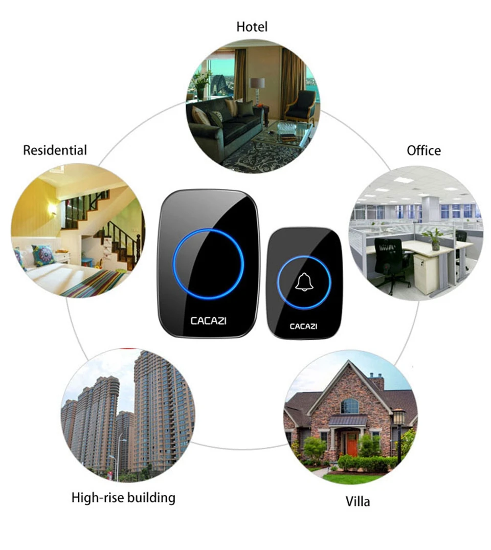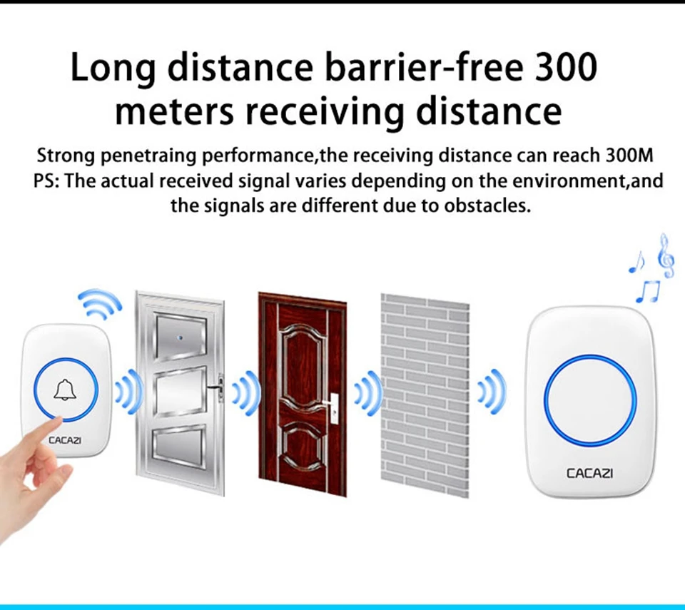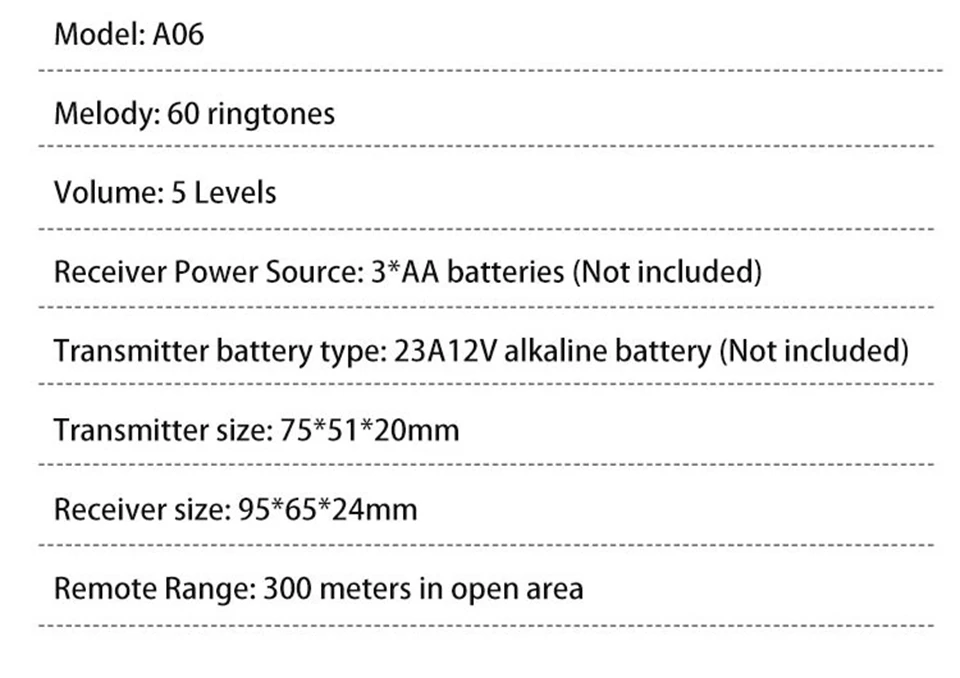 1. Нажмите кнопку, супер обучающий код может свободно научиться сочетать, может быть неограниченным подходящим приемником и кнопкой. 2. Передатчик без винтового патрона обеспечивает водонепроницаемость и защиту от пыли. 3. Передатчик использует щелочную батарею 23A12V (аккумулятор в комплект не входит). 4. Приемник использует 3 щелочные батареи AA, нет необходимости подключать источник питания, и аккумулятор может быть использован. (не включает батарею). 5. Расстояние приема: 300 метров на открытой местности. 6. На беспроводной сигнал будут влиять препятствия. Чем больше препятствий, тем серьезнее потеря сигнала. 7. Приемник имеет 5 уровней (можно отключить звук) 0-110 дБ, 60 музыки на выбор. 8. Размер передатчика: 77*51*20 мм 9. Размер приемника: 95*65*24 мм 10. Приемник можно повесить на стену или разместить на столе, где угодно, передатчик кнопки можно приклеить его к двери с помощью клейких лент. Примечание: Кнопка не может быть размещена на железной двери, потому что это будет мешать сигналу. Если приемник не звонит, когда вы нажимаете кнопку после получения дверного звонка, пожалуйста, проверьте шаги: 1. Пожалуйста, подтвердите, установлена ли кнопка щелочная батарея 23A12V. 2. Проверьте, установлен ли приемник щелочной батареи 3 * AA. 3. Пожалуйста, повторите сопряжение дверных колоколов.