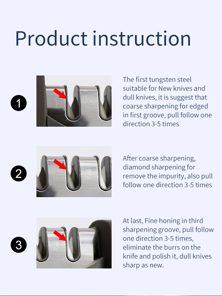 1. Стильный и безопасный дизайн, легко чистить и хранить. 2. Нескользящие резиновые ножки обеспечивают вашу устойчивость при заточке 3,3 стадии заточки (тонкая, керамическая и грубая), обеспечивают идеальный результат заточки