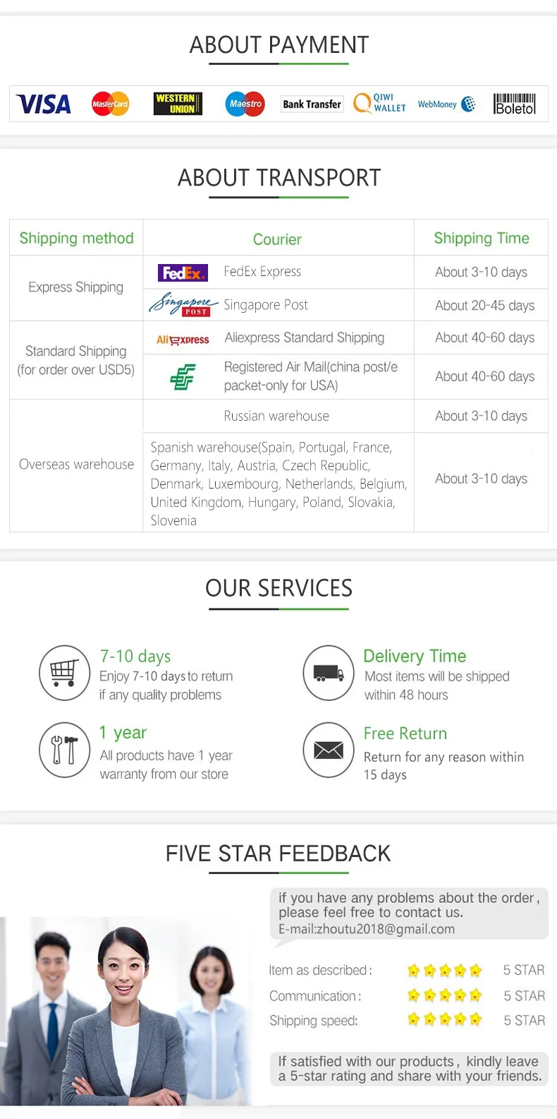 Напоминание о доставке: 1. Пожалуйста, заполните правильный почтовый индекс при заказе, в противном случае он не будет отправлен. Пожалуйста, проверьте правильный почтовый индекс на веб-сайте DHL http://dct.dhl.com/ . 2. Заполните ваше полное имя при оплате, включая имя, среднее имя и фамилию. 3. Заполните правильный адрес и номер телефона, включая номер квартиры, улицы, города, региона и страны/региона, в противном случае ваша посылка может быть возвращена. Налоговые: 1. Если товар отправляется из Китая, цена или фрахт не включают в себя импортные пошлины и налоги. Покупатель несет ответственность за оплату импортных пошлин, налогов и сборов. Это таможенная пошлина, не зависящая от нас. Осторожно! Пожалуйста, сначала проконсультируйтесь с таможней вашей страны/региона, чтобы определить, сколько этих дополнительных расходов будет до торгов/покупки. Примечания: Уважаемый покупатель, спасибо за ваш бизнес, если вы удовлетворены нашим обслуживанием, Пожалуйста, оставьте нам положительные отзывы и оцените информацию о транзакции (детальный рейтинг продавца) с надписью «perfect 5 stars». Ваше признание сделает нас более уверенными в развитии нашего бизнеса и улучшении обслуживания. Наша цель-убедиться, что вы довольны покупателем и покупаете у нас товары.