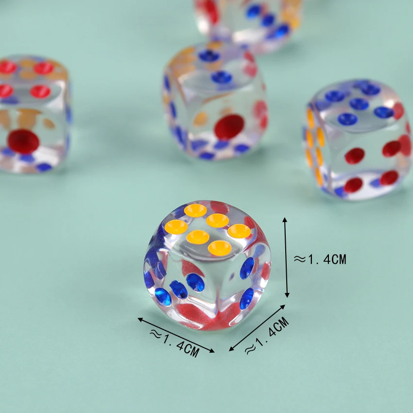 100% абсолютно новый высококачественный Изготовлен из высококачественного акрилового материала Идеально подходит для различных игр в кости и математических игр Материал: акрил Цвет: прозрачный Размер кости: около 14*14*14 мм Посылка включает в себя: игральные кости 10 шт.