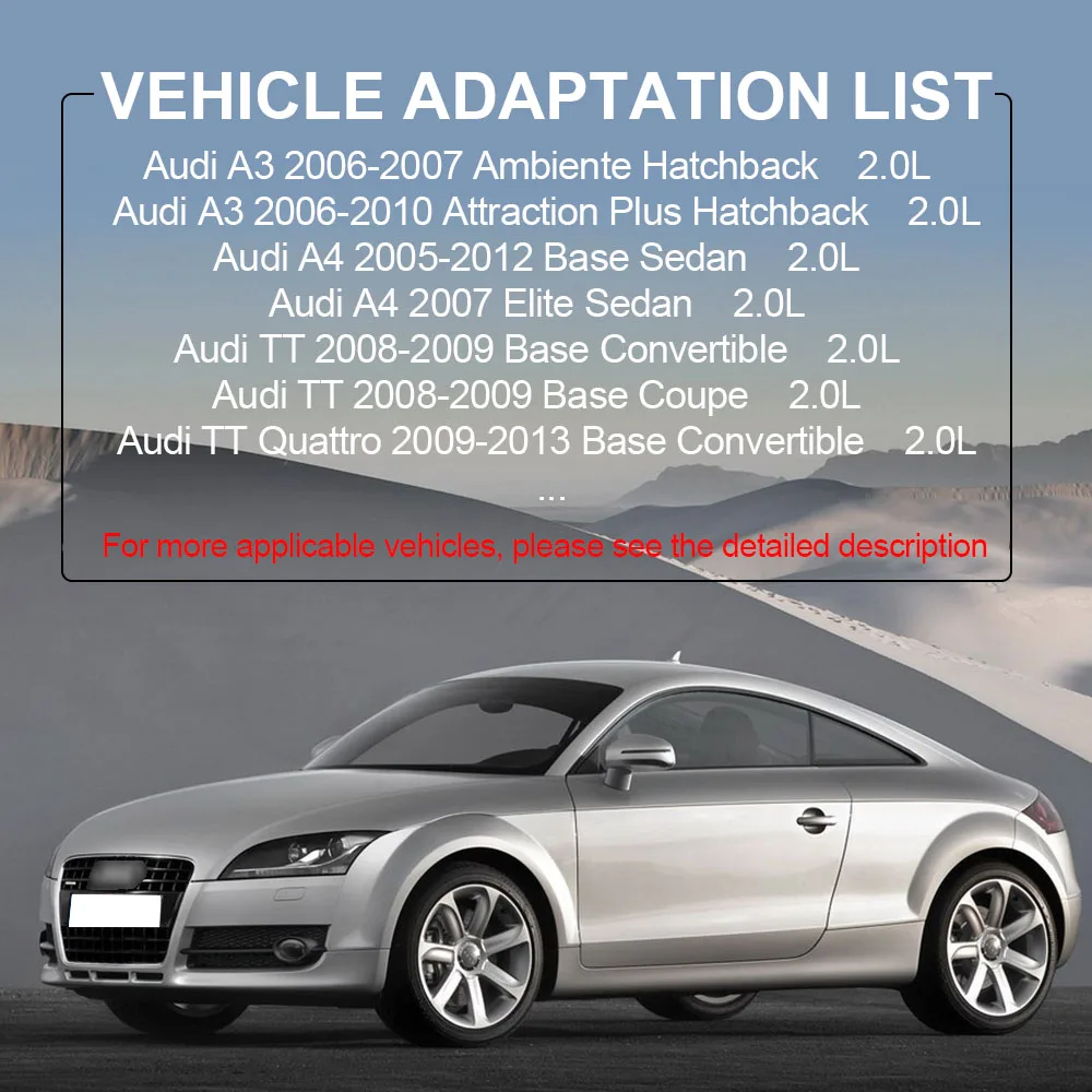 AudiA32006-2007Ambiente Hatchback 2.0L AudiA32006-2010Attraction Plus Hatchback 2.0L AudiA32006-2010Attraction Hatchback 2.0L AudiA32006-2010S Line Hatchback 2.0L AudiA32006-2013Base Hatchback 2.0L AudiA32007LE Hatchback 2.0L AudiA32007X Aniversario Hatchback 2.0L AudiA32009-2010Cabrio Convertible 2.0L AudiA32012-2013Attraction Hatchback 2.0L AudiA32012-2013Cabrio Convertible 2.0L AudiA42005-2012Base Sedan 2.0L AudiA42007Elite Sedan 2.0L AudiA42007S Line Sport Sedan 2.0L AudiA42007-2008Cabrio Elite Convertible 2.0L AudiA42007-2008Cabrio S Line Convertible 2.0L AudiA42007-2009Cabriolet Convertible 2.0L AudiA42007-2008S Line Sedan 2.0L AudiA42007-2012Trendy Sedan 2.0L AudiA42009Luxury Sedan 2.0L AudiA42009-2012Sport Sedan 2.0L AudiA42009-2012Trendy Plus Sedan 2.0L AudiA42011-2012Luxury Sedan 2.0L AudiA4 Quattro2005-2012Base Sedan 2.0L AudiA4 Quattro2005-2012Avant Wagon 2.0L AudiA4 Quattro2007-2009Cabriolet Convertible 2.0L AudiA4 Quattro2007DTM Sedan 2.0L AudiA4 Quattro2007-2008Elite Sedan 2.0L AudiA4 Quattro2008S Line Sedan 2.0L AudiA4 Quattro2008S Line Sport Sedan 2.0L AudiA4 Quattro2008Trendy Sedan 2.0L AudiA4 Quattro2011-2012Luxury Sedan 2.0L AudiA4 Quattro2011-2012Sport Sedan 2.0L AudiA52010-2012Cabriolet Convertible 2.0L AudiA52011-2012Luxury Hatchback 2.0L AudiA52012Base Convertible 2.0L AudiA52012Luxury Coupe 2.0L AudiA5 Quattro2010-2012Base Coupe 2.0L AudiA5 Quattro2011Base Convertible 2.0L AudiA5 Quattro2011Luxury Coupe 2.0L AudiA5 Quattro2011-2012S Line Coupe 2.0L AudiA5 Quattro2012Premium Convertible 2.0L AudiA5 Quattro2012Premium Coupe 2.0L AudiA5 Quattro2012Premium Plus Convertible 2.0L AudiA5 Quattro2012Premium Plus Coupe 2.0L AudiA62012-2013Premium Plus Sedan 2.0L AudiA62012-2013Premium Sedan 2.0L AudiA62013Luxury Sedan 2.0L AudiA62013S Line Sedan 2.0L AudiA6 Quattro2013Base Sedan 2.0L AudiA6 Quattro2013Premium Plus Sedan 2.0L AudiQ52011Base Sport Utility 2.0L AudiQ52011-2012Elite Sport Utility 2.0L AudiQ52011-2012Luxury Sport Utility 2.0L AudiQ52011-2012Premium Plus Sport Utility 2.0L AudiQ52011-2012Premium Sport Utility 2.0L AudiQ52011-2012Trendy Sport Utility 2.0L AudiTT2008-2009Base Convertible 2.0L AudiTT2008-2009Base Coupe 2.0L AudiTT Quattro2009-2013Base Convertible 2.0L AudiTT Quattro2009-2013Base Coupe 2.0L AudiTT Quattro2012-2013Premium Plus Convertible 2.0L AudiTT Quattro2012-2013Premium Plus Coupe 2.0L AudiTT Quattro2012-2013Prestige Convertible 2.0L AudiTT Quattro2012-2013Prestige Coupe 2.0L AudiTTS Quattro2009-2013Base Convertible 2.0L AudiTTS Quattro2009-2013Base Coupe 2.0L VWGTI2006-2013Base Hatchback 2.0L VWGTI2007Fahrenheit Hatchback 2.0L VWJetta2006-20082.0T Sedan 2.0L VWJetta2006475 Aniversario Sedan 2.0L VWJetta2006-2009Europa Sedan 2.0L VWJetta2006-2009GLI Sedan 2.0L VWJetta2006Soccer 1 Sedan 2.0L VWJetta2006Soccer 2 Sedan 2.0L VWJetta2006-2010Trendline Sedan 2.0L VWJetta2006Winter 1 Sedan 2.0L VWJetta2006Winter 2 Sedan 2.0L VWJetta2008-2010Wolfsburg Edition Sedan 2.0L VWJetta2009SEL Sedan 2.0L VWJetta2009SEL Wagon 2.0L VWJetta2010City Sedan 2.0L VWJetta2010Clasico Sedan 2.0L VWJetta2012Trendline Wagon 2.0L VWJetta2012-2013GLI Sedan 2.0L VWJetta2012-2013S Sedan 2.0L VWJetta2012-2013S Wagon 2.0L VWJetta2012-2013TDI Sedan 2.0L VWJetta2012-2013Trendline Sedan 2.0L VWJetta2013Base Sedan 2.0L VWCC2009-2011Luxury Sedan 2.0L VWCC2009-2013Sport Sedan 2.0L VWCC2012Lux Limited Sedan 2.0L VWCC2012Lux Plus Sedan 2.0L VWCC2012-2013Lux Sedan 2.0L VWCC2011-2013Highline Sedan 2.0L VWCC2011-2012R-Line Sedan 2.0L VWCC2011-2013Sportline Sedan 2.0L VWCC2013Base Sedan 2.0L VWCC2013Sport Plus Sedan 2.0L VWPassat2006-20092.0T Sedan 2.0L VWPassat2006-2007Value Edition Sedan 2.0L VWPassat2007-20082.0T Wagon 2.0L VWPassat2007Value Edition Wagon 2.0L VWPassat2007Wolfsburg Edition Sedan 2.0L VWPassat2008Base Sedan 2.0L VWPassat2008Base Wagon 2.0L VWPassat2008-2010Komfort Sedan 2.0L VWPassat2008-2010Komfort Wagon 2.0L VWPassat2008Lux Sedan 2.0L VWPassat2008Lux Wagon 2.0L VWPassat2008Turbo Sedan 2.0L VWPassat2008Turbo Wagon 2.0L VWPassat2009-2010Comfortline Sedan 2.0L VWPassat2009-2010Comfortline Wagon 2.0L VWPassat2009-2010Highline Sedan 2.0L VWPassat2009-2010Highline Wagon 2.0L VWPassat2009-2010Trendline Sedan 2.0L VWPassat2009-2010Trendline Wagon 2.0L VWPassat2010Base Sedan 2.0L VWPassat CC2009-2010Highline Sedan 2.0L VWPassat CC2009-2010Sportline Sedan 2.0L VWPassat CC2010CC Sedan 2.0L VWTiguan2009-2010Base Sport Utility 2.0L VWTiguan2009-2013Comfortline Sport Utility 2.0L VWTiguan2009-2013Highline Sport Utility 2.0L VWTiguan2009-2013Native Sport Utility 2.0L VWTiguan2009-2013SEL Sport Utility 2.0L VWTiguan2009-2013SE Sport Utility 2.0L VWTiguan2009-2013S Sport Utility 2.0L VWTiguan2009-2013Track & Fun Sport Utility 2.0L VWTiguan2009-2013Trendline Sport Utility 2.0L VWTiguan2010Wolfsburg Edition Sport Utility 2.0L VWTiguan2012-2013Sport & Style Sport Utility 2.0L VWEos2007-20082.0T Convertible 2.0L VWEos2007Base Convertible 2.0L VWEos2008-2013Komfort Convertible 2.0L VWEos2008-2013Lux Convertible 2.0L VWEos2008Turbo Convertible 2.0L VWEos2009-2013Comfortline Convertible 2.0L VWEos2009Trendline Convertible 2.0L VWEos2010Base Convertible 2.0L VWEos2010-2013Highline Convertible 2.0L VWEos2012-2013Executive Convertible 2.0L VWEos2013Sport Convertible 2.0L VWBeetle2012-2013Sportline Hatchback 2.0L VWBeetle2012-2013Turbo Hatchback 2.0L VWBeetle2013Fender Hatchback 2.0L VWBeetle2013Turbo Convertible 2.0L