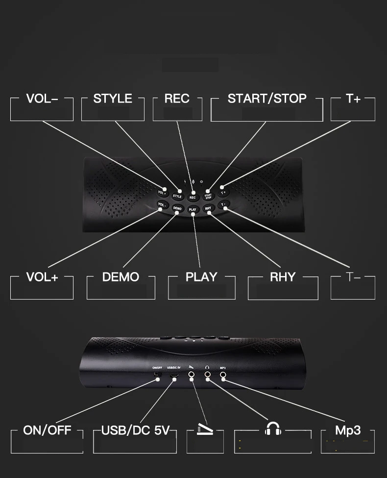 With 1000mA lithium battery and supports recording and playback functions; 9 levels of volume control and 15 levels of demo songs/ accompaniment playing speed adjusting for flexible operation.
