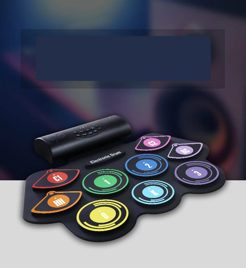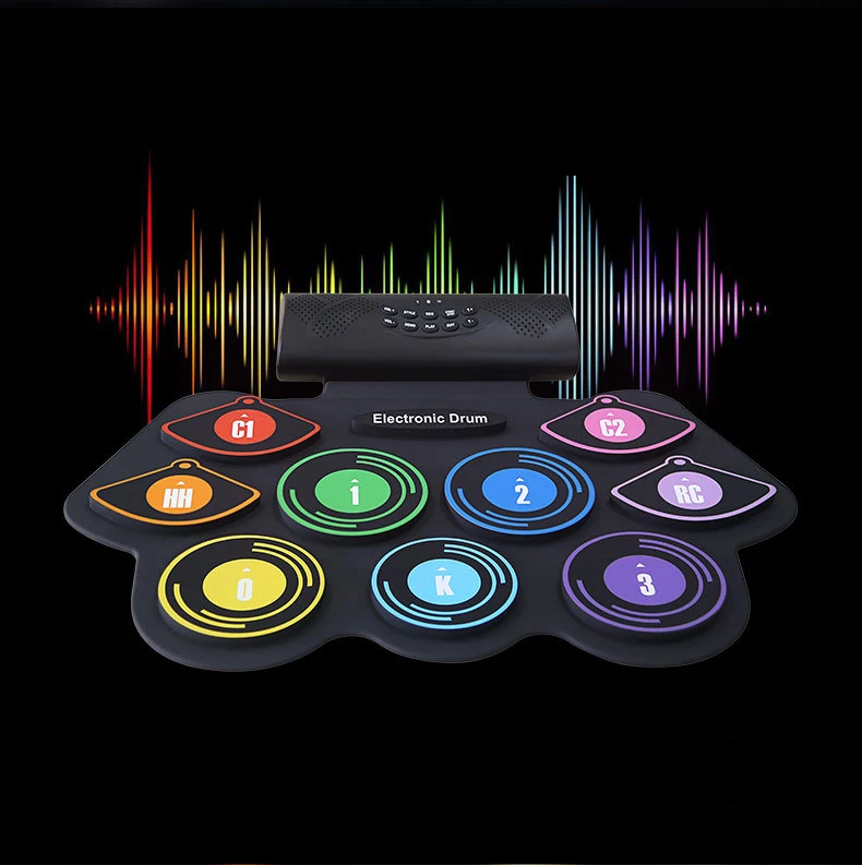 Portable electronic drum with 9 silicon drum pads including Tom(3)/Snare/ Bass drums, Hi-Hat/Crash(2)/Ride cymbals, making excellent sounds and simulating real beating effect.