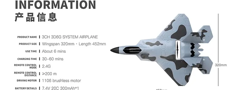 Номер товара: A180 (F22) Описание товара: 3D/6G Материал изделия: EPP Размер изделия (мм): размах крыльев 320 длина 452 Полета Вес:80 г Упаковка: цветная коробка Цвет: камуфляжные футболки в мозаичном стиле Время полета: около 6 минут Время зарядки: 30-60 минут Режим дистанционного управления: пульт дистанционного управления 2,4G Расстояние дистанционного управления (м): около 200 метров Количество приводных двигателей: высокая производительность 1106 бесщеточный двигатель Батарея: 7,4 V 300 мА · ч (входит в комплект) Особенности: 1 Использование высокоэффективного бесщеточного двигателя, полная мощность. Система 3D6G имеет повышенную стабильность, разумную аэродинамическую схему, очень стабильный полет, и новички могут легко летать в состоянии 6G. 2. Материал EPP полностью сформирован, имеет гладкий внешний вид, реальный срок службы и очень ударопрочный. Общий вес составляет всего 76 г. 4 3-осевой 6-осевой гироскоп функция преобразования режима, 3-осевым гироскопом Режим блокировки, повышенная стабильность отношения, 6-осевой режим повышенную устойчивость, В любой чехол, пока джойстик будет выпущен, самолет будет поддерживать стабильное отношение полета. 5 Пульт дистанционного управления оснащен большими и маленькими настройками руля. Маленький руль подходит для начинающих, а большой руль более чувствителен. 6 оснащен аккумулятором с высокой разрядкой, мощность полета составляет около 6 минут. Упаковочный лист: Цветная упаковка * 1 Пульт дистанционного управления * 1 Руководство * 1 Зарядное устройство * 1 Запасное лезвие * 1