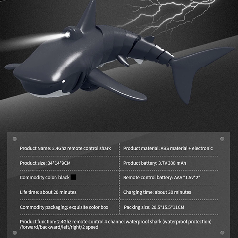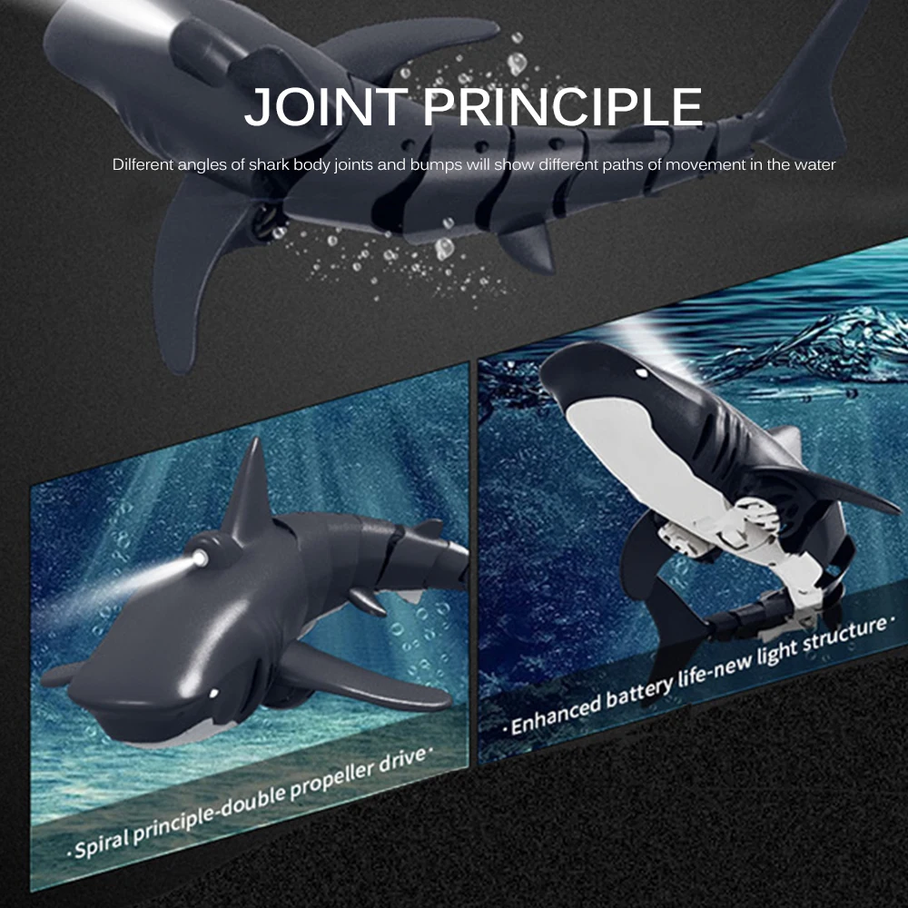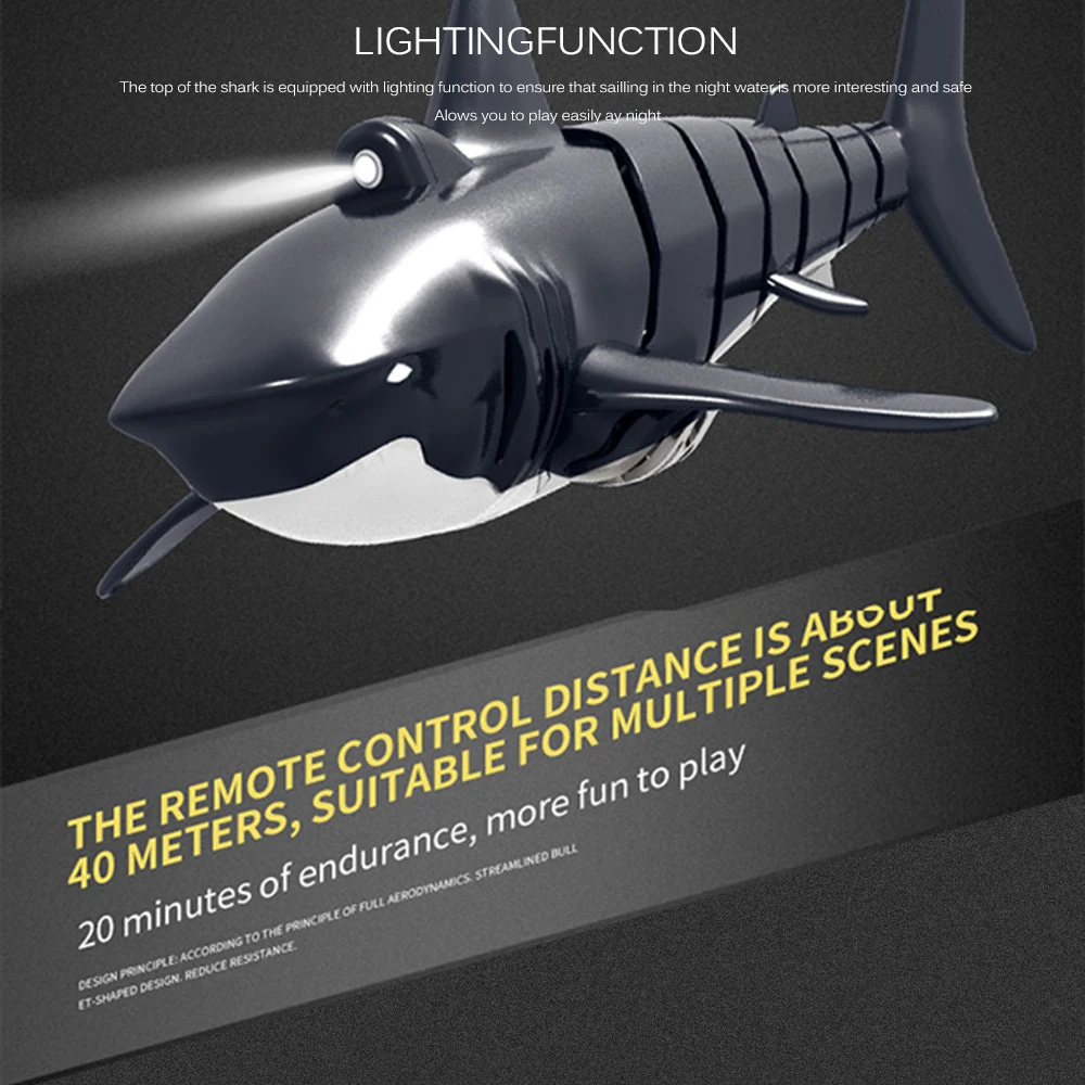 Разработанный с гладкой круглой кромкой, чтобы уменьшить водонепроницаемость, Гибкий Хвост, чтобы контролировать направление, шнек для придания мощной движущей силы, игрушка в форме акулы обладает сильной способностью плавать.