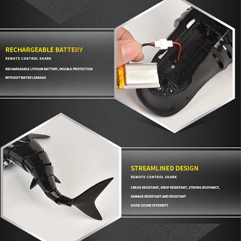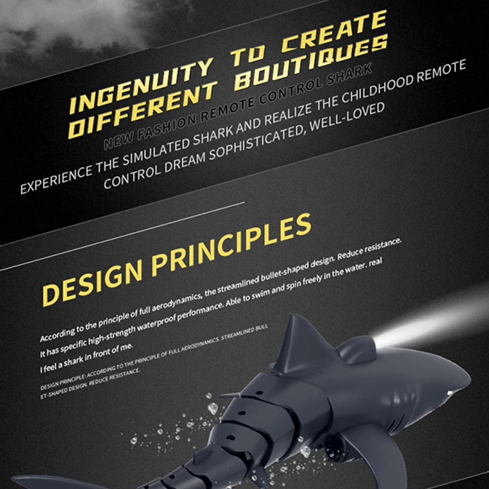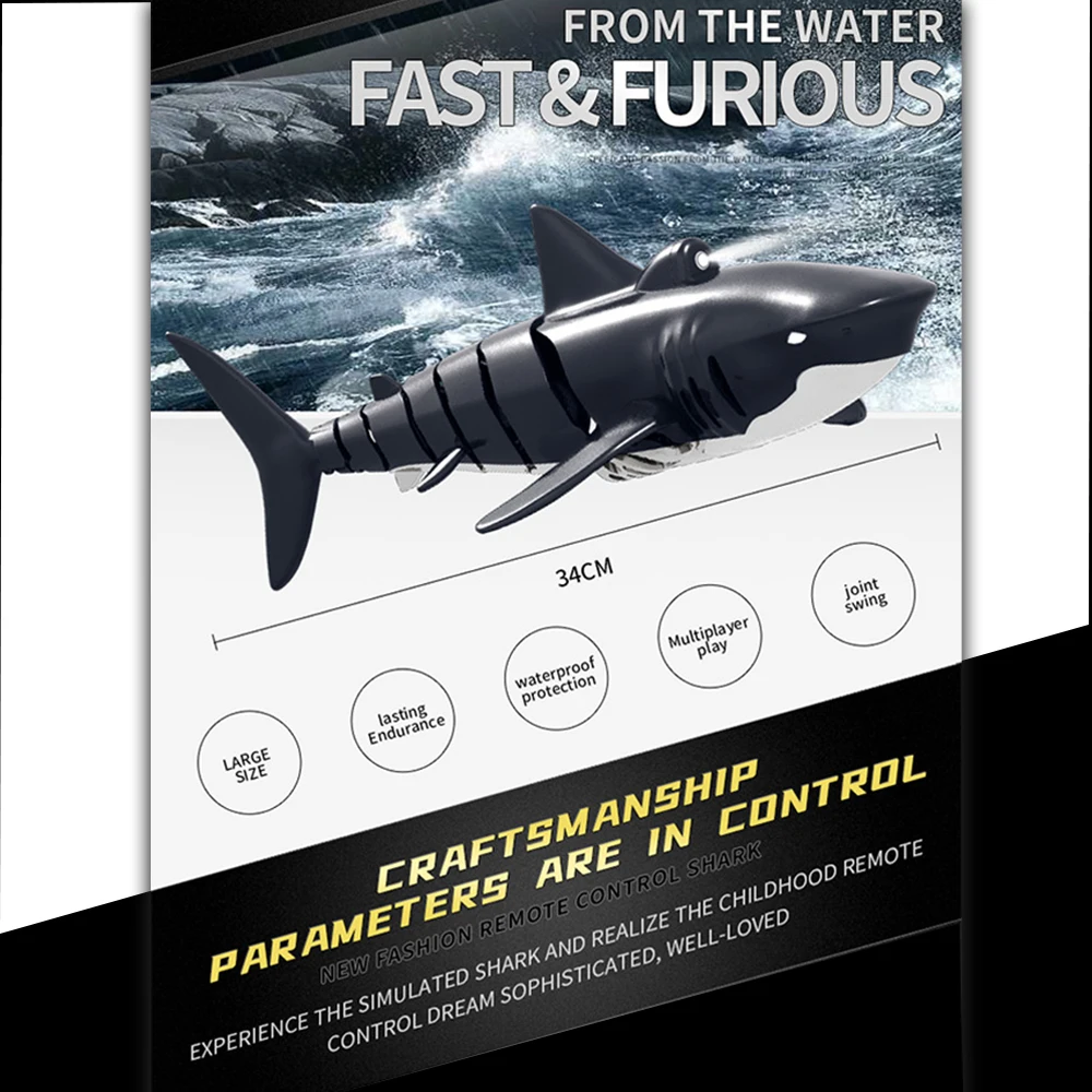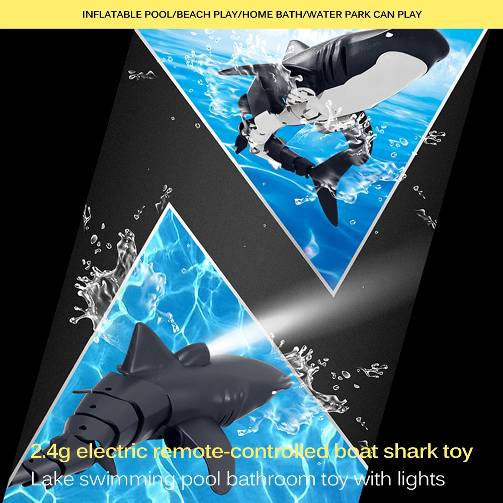 Разработанный с гладкой круглой кромкой, чтобы уменьшить водонепроницаемость, Гибкий Хвост, чтобы контролировать направление, шнек для придания мощной движущей силы, игрушка в форме акулы обладает сильной способностью плавать.