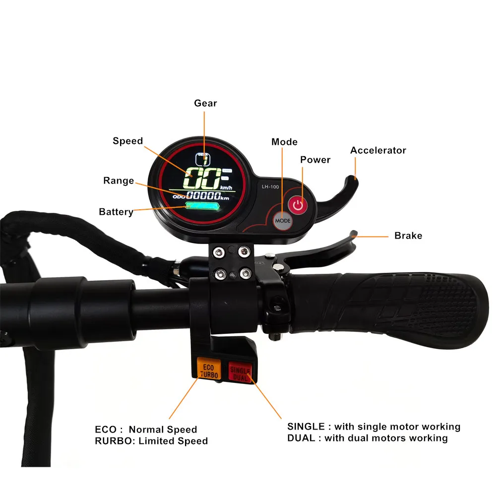 -Рама из алюминиевого сплава -- 11-дюймовые внедорожные/дорожные шины -- Максимальная нагрузка: около 180 кг -- Максимальная скорость около 85 км/ч (может быть ограничена скорость 25 км/ч с помощью Шестерни 1 + Кнопка TURBO) -- С 2 зарядными устройствами -- Хорошие Подвески... -- Вес нетто: около 41-46 кг Диапазон: Аккумулятор Panasonic 35 Ач: около 80-100 км Аккумулятор Panasonic 40 Ач: около 100-120 км (Тест зависит от веса гонщика 60 кг, состояния плоской дороги, погоды 30 градусов, фиксированной скорости 60 км/ч...)