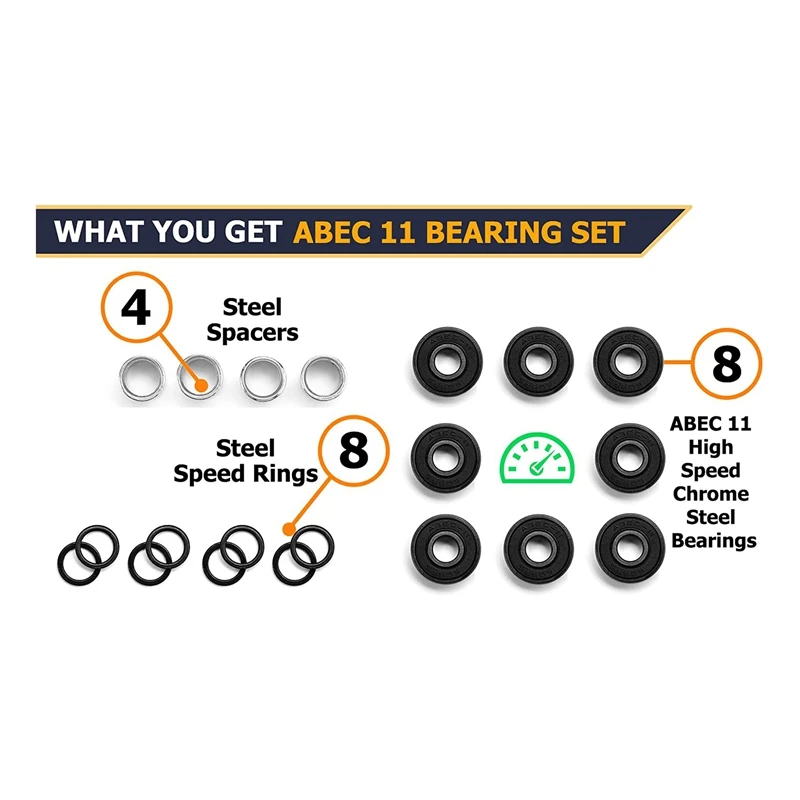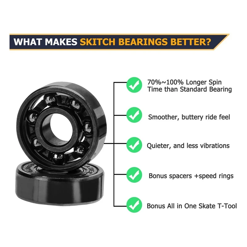 1. Хромированная сталь, внутренняя и внешняя гонки, шарики премиум класса, отличная скорость, нейлоновый мяч фиксатор. Отличное время вращения, низкие трения, супер-быстрые подшипники для катания на коньках.