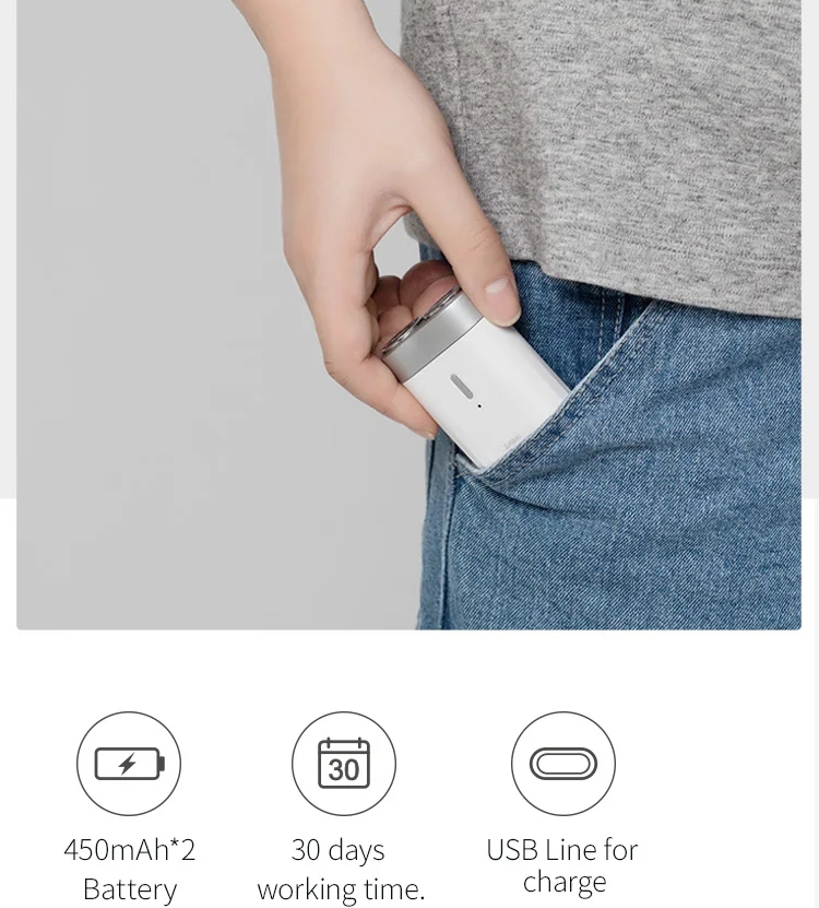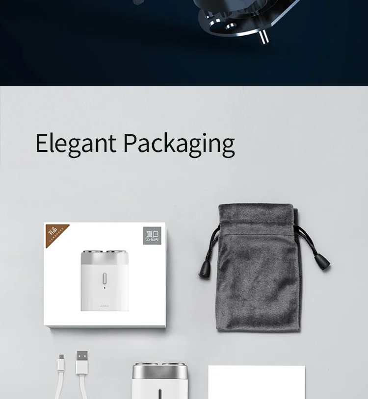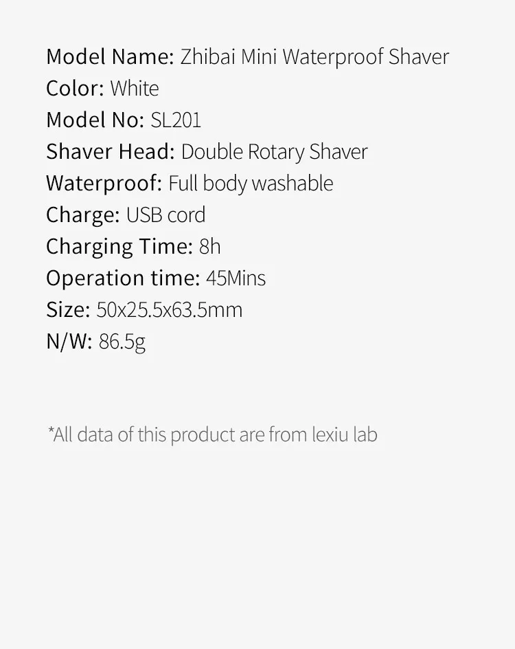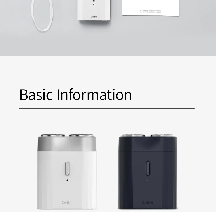 Название модели: ZHIBAI Mini Водонепроницаемая бритва Цвет: белый/черный Номер модели: SL201-2 Бритвенная головка: двойная Вращающаяся бритва Водонепроницаемый: Полностью моющийся Зарядка: USB шнур Время зарядки: 8 ч Время работы: 45 минут Размер: 50*25,5*63,5 мм N/W: 86,5 г Посылка: бритва + коробка + сумка для переноски + usb-кабель