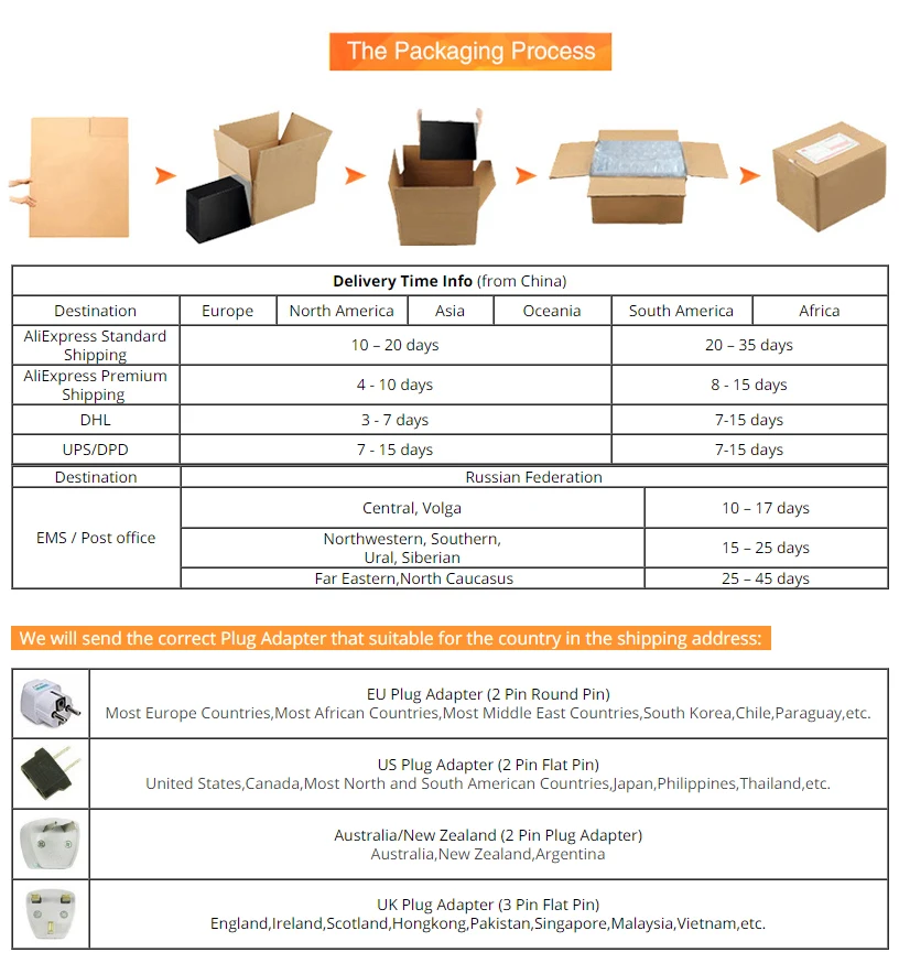 Если вы используете DHL, чтобы отправить его, ожидается Доставка в течение 3-9 дней, но вы можете оплатить таможенные пошлины и налоги за что-то, купленное онлайн. Покупатели несут ответственность за таможенные пошлиныЕсли у вас есть особые требования, пожалуйста, оставьте сообщение при размещении заказа или свяжитесь с нами.Гарантия:Мы предлагаем трехлетнюю гарантию наПродукты.Если есть какие-либо повреждения, мы вышлем вам бесплатные детали, пожалуйста, установите его (мы отправим вам Установочное видео).Но если он поврежден человеческими факторами, или если он разрушен внешними силами, вам нужно будет оплатить некоторые сборы.