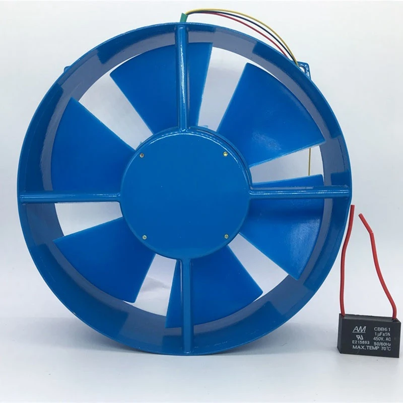 Продукт состоит из однофазного асинхронного двигателя, однофланцевого цилиндрического корпуса и лопастей.