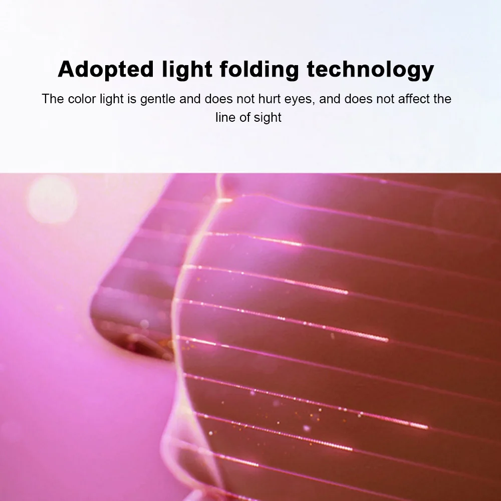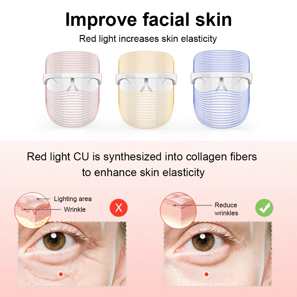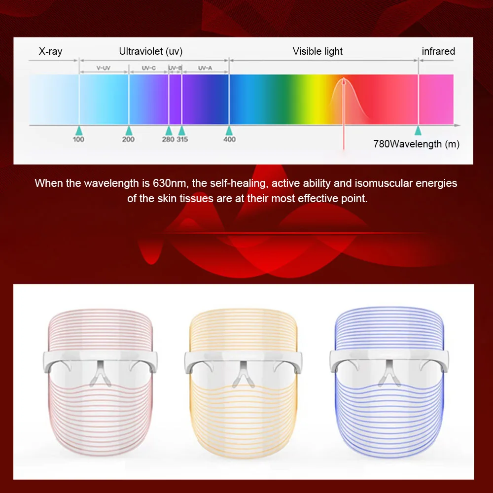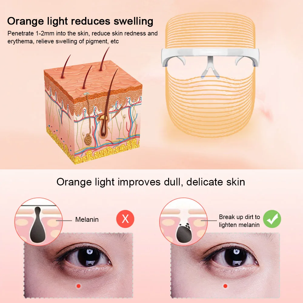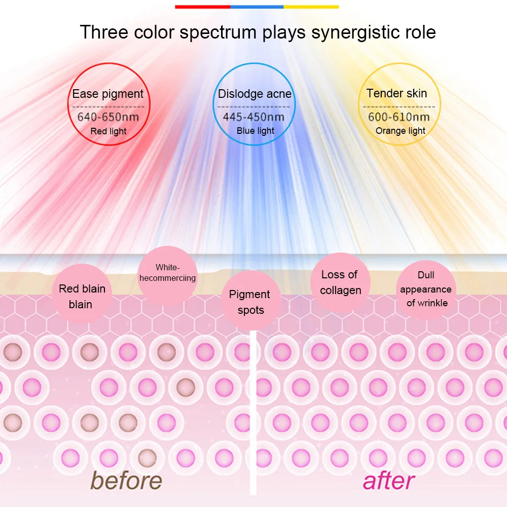 Три цветовых спектра играют важную роль:Красный светильник повышает эластичность кожи, синий светильник уменьшает поры и оранжевый светильник уменьшает отек.