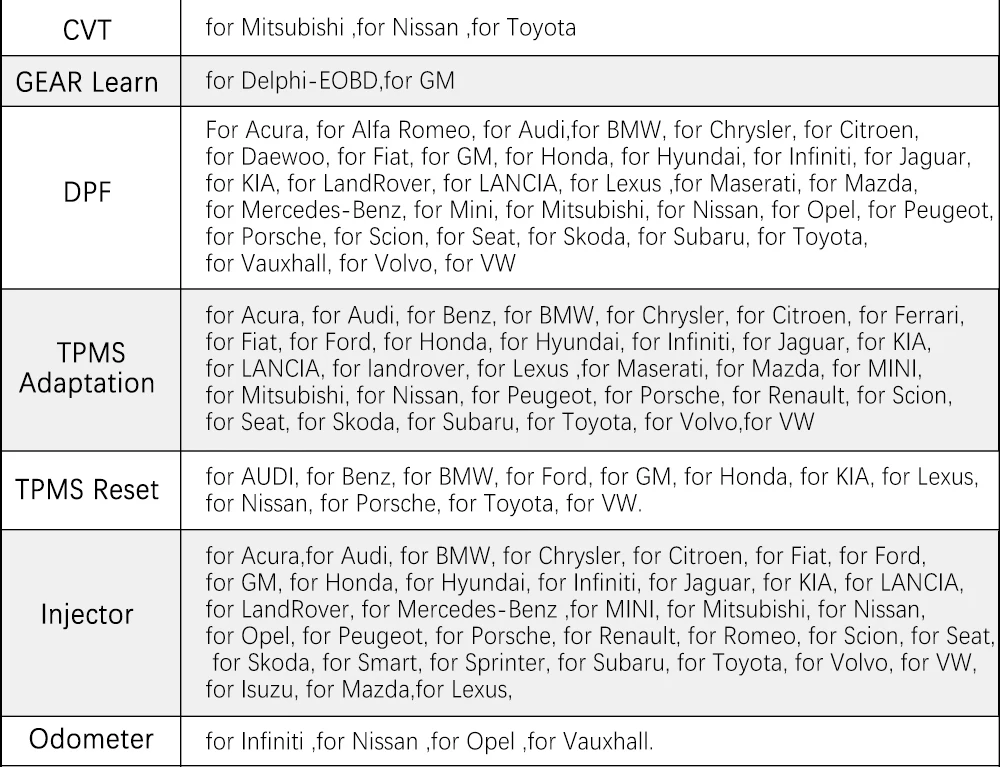1. Сброс масляного освещения: Выполните сброс для системы срока службы моторного масла, которая подсчитывает оптимальный интервал изменения срока службы масла в зависимости от условий вождения автомобиля и погоды. 2. Регенерация дизельного сажевого фильтра DPF: Управление регенерацией DPF, замена компонентов DPF teach-in и DPF teach-in после замены блока управления двигателем. 3. Сброс датчика рулевого управления SAS: Выполните калибровку для датчика угла поворота рулевого колеса, который постоянно сохраняет текущее положение рулевого колеса как прямое положение в датчике EEPROM. 4.EPB Электронный сброс тормозов: Поддерживать электронную тормозную систему безопасно и эффективно, деактивируя и активируя систему управления тормозом, устанавливая тормоза после замены диска или колодки и т. Д. 5. Система контроля давления в шинах TPMS: Быстро найдите идентификационные номера датчика шин от ЭБУ транспортного средства, а также выполните замену TPMS и Тест датчика. 6.IMMO сервис: Отключите ключи от утерянного автомобиля и запрограммируйте сменный брелок. 7. Кодирование инжектора: Для точной связи и системы управления впрыском необходимо программировать ID и параметры к Эбу. И т. д...
