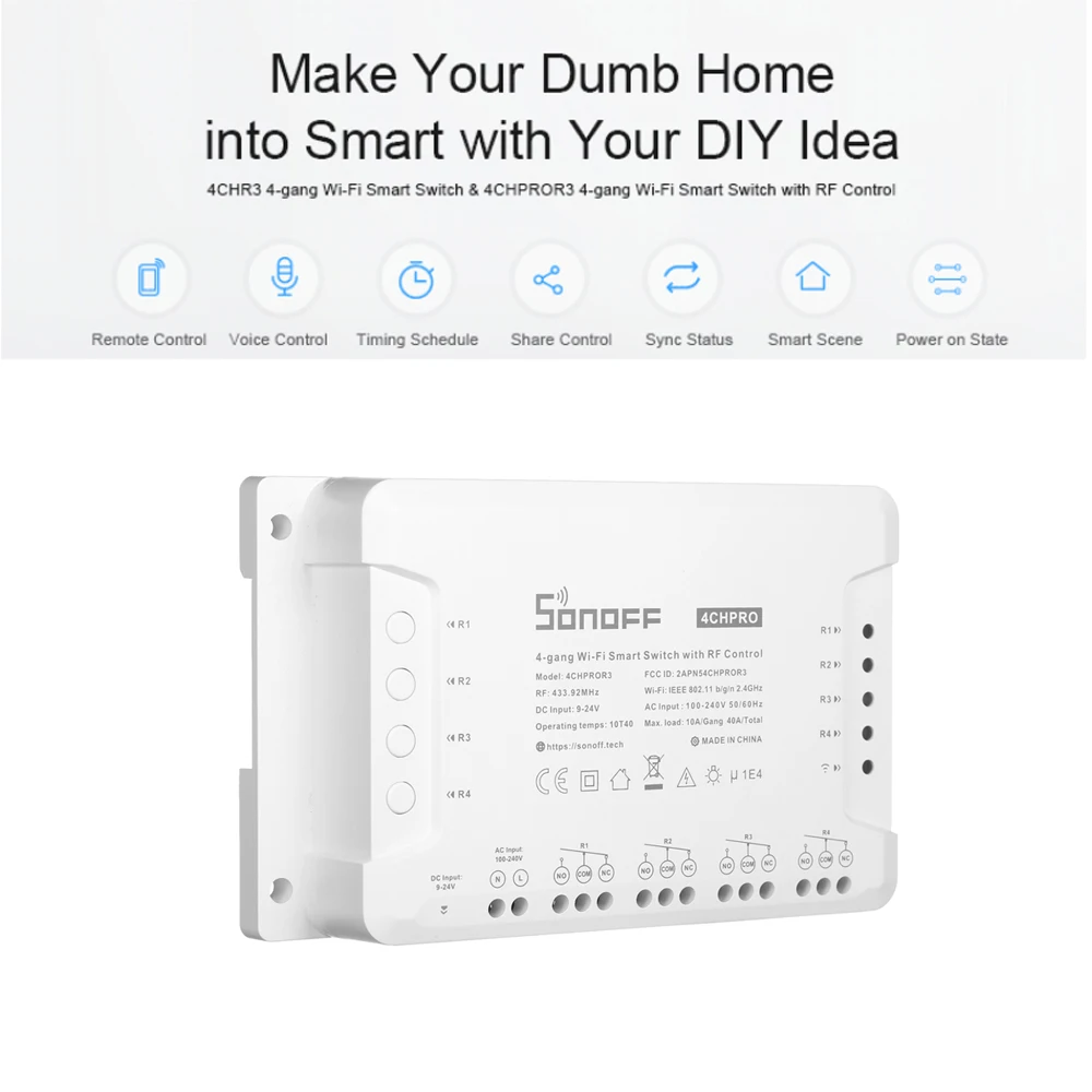 Sonoff 4CH R3 ITEAD-это 4-канальный универсальный беспроводной умный переключатель Wi-Fi для вашей системы умного дома для удаленного и автоматического включения/выключения бытовой техники и электронных устройств через приложение для телефона. Он может подключать и управлять четырьмя устройствами в приложении одновременно, и вы можете самостоятельно включать/выключать каждую из четырех банд. Он также поддерживает включение/выключение приборов по времени и обмен данными с другими устройствами, чтобы вы могли управлять своим умным домом вместе с семьей. Вы также можете управлять голосом своей бытовой техникой с помощью Amazon Alexa, Google home/Nest, а также наслаждаться интеллектуальной жизнью и сделать ваш дом умнее.![]()