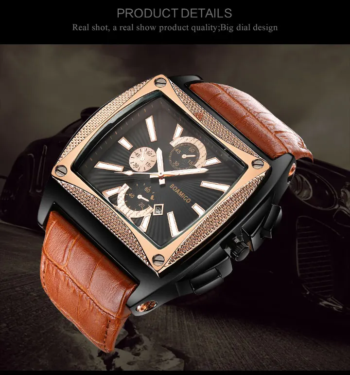 Ключевые точки: 1. Функция: дата, время 2. Тип: мужские модные часы 3. Движение: аналоговый дисплей 4. Материал ремешка: кожа 5. Показывает точное время 6. Это лучшие подарки на Рождество, Новый Год, день рождения и так далее Характеристика: Диаметр корпуса: 4,2 см Толщина корпуса: 1,9 см Длина ремешка: 26,5 см Ширина ремешка: 3,2 см Вес: около 162 г Какая посылка 1 часы Бренд Story Часы бренда BOAMIGO состоят из обновленных классических часов для более модного потребителя. Часы разработаны с большими чехлами, специальной и спортивной кожей, резиновыми или металлическими ремешками, чтобы создать свежий вид. И наши часы сочетают в себе качество, передовую моду, дух спорта и ценность. А также модная и повседневная одежда для повседневного ношения. Наши часы всегда с хорошей стоимостью, но недорогой ценой. Добро пожаловать к любому клиенту, чтобы насладиться нашими часами и стать более модным. Вам также может понравиться: