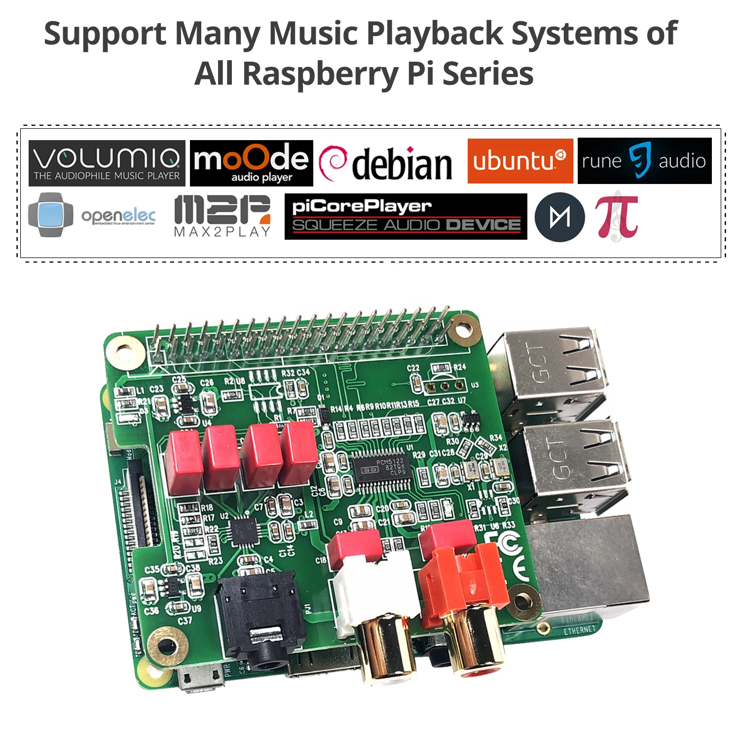 HiFi ЦАП шляпа Совместимость с Raspberry Pi Zero & Zero W, 3B, 3B + инвойсовая стоимость 4 с 40-pin разъем. Подключается непосредственно к плате Raspberry Pi, никаких дополнительных кабелей не требуется, без пайки. Легко получить более красивый и фантастический звук от этого RPI + DAC HiFi костюмов. Абсолютно идеально подходит для поддержки всех систем воспроизведения музыки Raspberry Pi, таких как OSMC, Max2Play, RuneAudio, Volumio, Moode, PiCorePlayer, PiMusicBox, OpenELEC, Debian, ubuntu и т. д. поддерживает воспроизведение музыки с жесткого диска или по сети. Поддержка DSD в режиме PCM(DOP). Лучшие в своем классе стерео аудио ЦАП PCM5122, образец процентная ставка до 384-KHz/32-Bit. В паре с стереофоническим высокоточным усилителем для наушников TPA6133. Обеспечивает 2,1 Vrms наземные выходы в сочетании с пленочным конденсатором. Бортовой пару с позолотой RCA (левое и правое) домкраты и 3,5 мм high-end для наушников выход, позволяют вам свободу движения, Воспроизводите музыку через Raspberry Pi к другому клеммы. Поставляется с программным обеспечением, поддержкой документов и дружественной технологией. Для получения дополнительной информации, пожалуйста, обратитесь к нашей вики (просмотреть ссылку на страницу цвета поставляется с товарами).