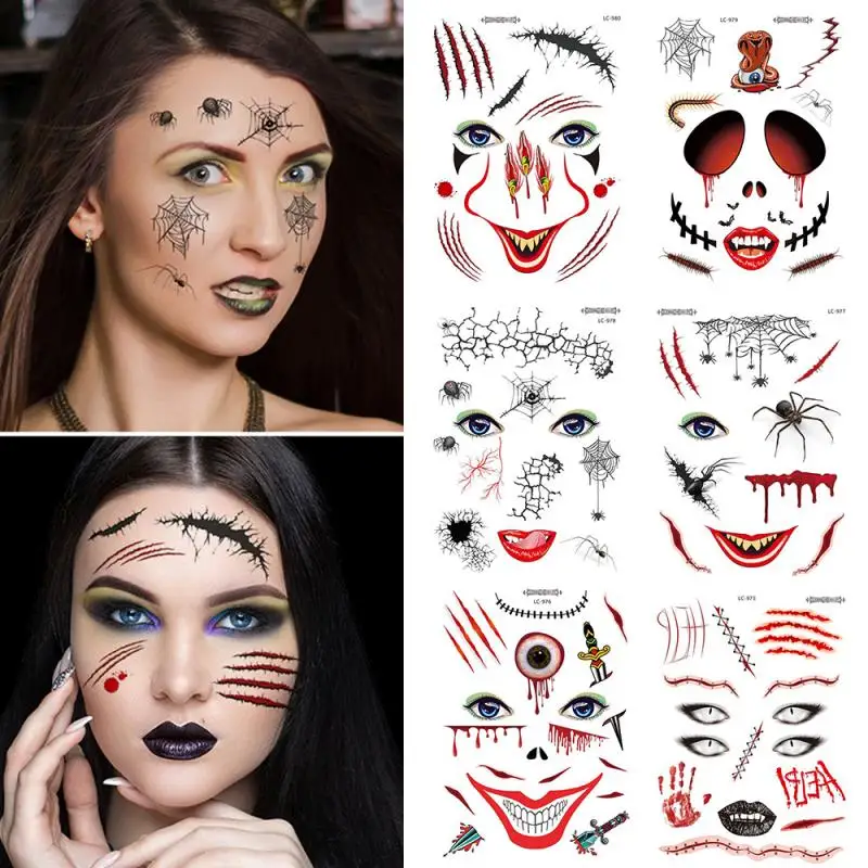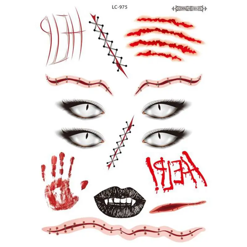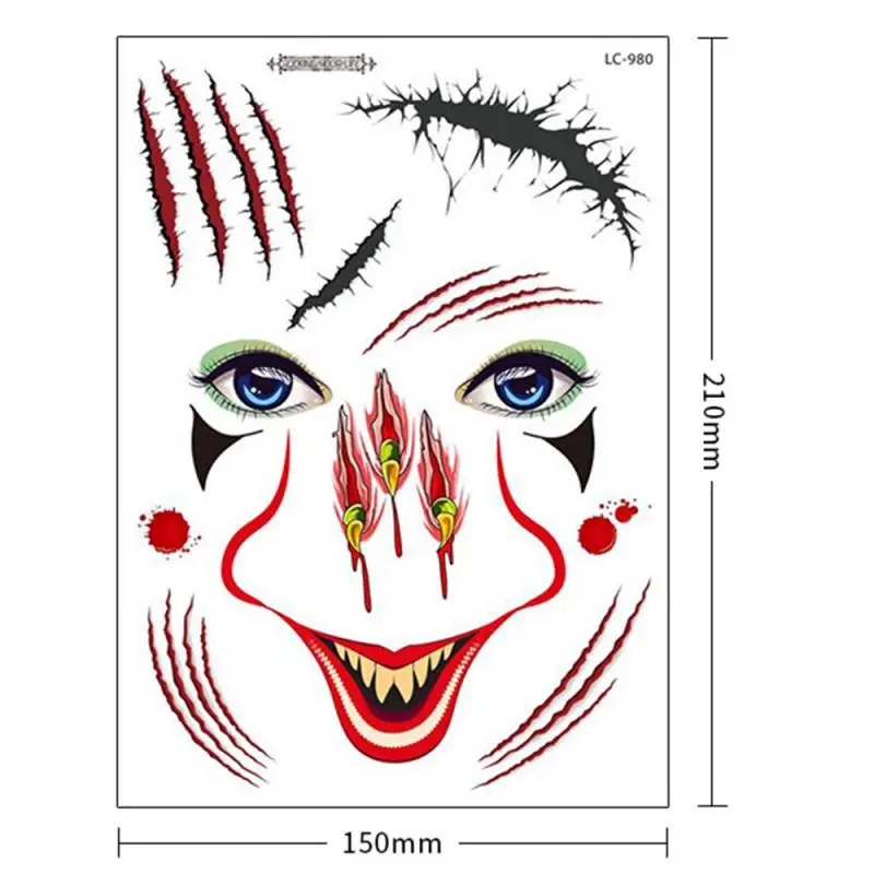 Эта водонепроницаемая модель для Хэллоуина лицевая наклейка тату имеет множество рисунков. Каждый узор не слишком сложный, атмосфера забавная, реалистичная форма шрама, а Маскарад-отличный выбор.