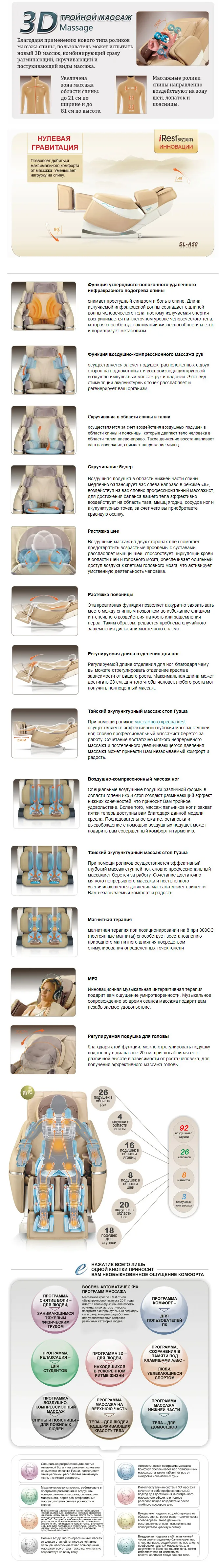 Стильный дизайн, современныe технологии и новые функции, все это воплотилось в новом флагмане компании iRest, роботизированном массажном кресле SL-A50, которое заставит вас погрузиться в мир удовольствия и комфорта. Разложив массажное кресло в положение нулевой гравитации, Вы в полной мере сможете насладиться массажем под любимую музыку, льющуюся из встроенных над головой динамиков.