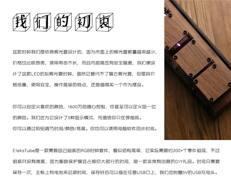 Описание: Часы Lixie-это полноцветные электронные часы RGB в стиле ретро. Из-за увеличения привлекательности светящейся разрядной трубки. Все больше и больше людей хотят там иметь светящиеся трубки часы. Но светящаяся трубка уже давно не выпускается, с момента распада СССР. Так что теперь трудно получить новую трубку свечения. Сегодня часы lixie привели к совершенно новому дизайну RGB Ретро полноцветного моделирования светящейся трубки электронных часов. Спецификация: ОБЩАЯ СПЕЦИФИКАЦИЯ Материал корпуса дерево, акрил Функциональные электронные настольные часы, таймер, светящиеся трубки Размеры одного бита (Д * Ш * В) 43x43x65мм 6-Bit Комплект Размеры (Д * Ш * В) 33x8.5x9.5cm Применение Pefect как настольные украшения дома, спальни, гостиной Комната, выставочный зал, ресторан, столовая, кофе Кафе, класс, лаборатория и т. Д. Технические параметры Источник питания Mirco USB Бит 6, отображение секунд, минут и часов легко Светодиодный светильник Полноцветный светильник RGB, Выберите любимый цвет Режим отображения 2 режима: часовой механизм и секундомер Программное обеспечение управления liexie clock, официальное программное обеспечение, предоставляемое liexie clock Особенности: -Часы lixie используют инновационный способ имитировать реальность светящейся трубки, которая может подключить ваш компьютер, чтобы изменить свой цвет с вашего ума. И добавить полноцветную функцию обесцвечивания RGB. Полностью поддерживает систему Windows/Mac. -Часы liexie предоставляют вам широкий выбор. В настоящее время вы можете купить 6 бит бамбукового материала. В ближайшее время будет сделан дополнительный выбор. -У них есть технология черного металлического анодного алюминиевого сплава, а также встроенный основной контроллер и цветная трубчатая лампа 1600 Вт, разработанная loxoe clock. Добавьте новую страсть и творчество к своему художественному творению. -Вы можете выбрать любой цвет. Часы lixue поддерживают режим часов в реальном времени и режим остановки часов. Как играть: 1. Просто включите часы liexie через кабель Micro USB, подключите к розетке компьютера или розетке. Затем часы светятся. 2. Теперь часы liexie предоставляют вам 2 режима отображения: Подходит для: ① режим синхронизации: отображает в режиме реального времени в 24-часовой формат времени системы. ② Секундомер: отображает минуты, секунды и 1/100 секунд. (Примечание: по умолчанию используется режим часов. Режим остановки часов доступен только в программном обеспечении.) Инструкции: Дополнительные инструкции см. В официальной Вики EleksMaker. Шаги сборки: нажмите здесь Программное обеспечение и управление для Windows: нажмите здесь Программное обеспечение и управление для Mac: нажмите здесь * Шестигранная стойка будет отправлена как металл (серебряный цвет) или нейлон (черный цвет) материал случайным образом, так как он может исходить из различных партий. Надеюсь, вы рассмотрите это перед покупкой и спасибо за понимание. Посылка включает в себя: 1 x набор часов lixie 6 бит (не в сборе) 1 кабель Micro USB