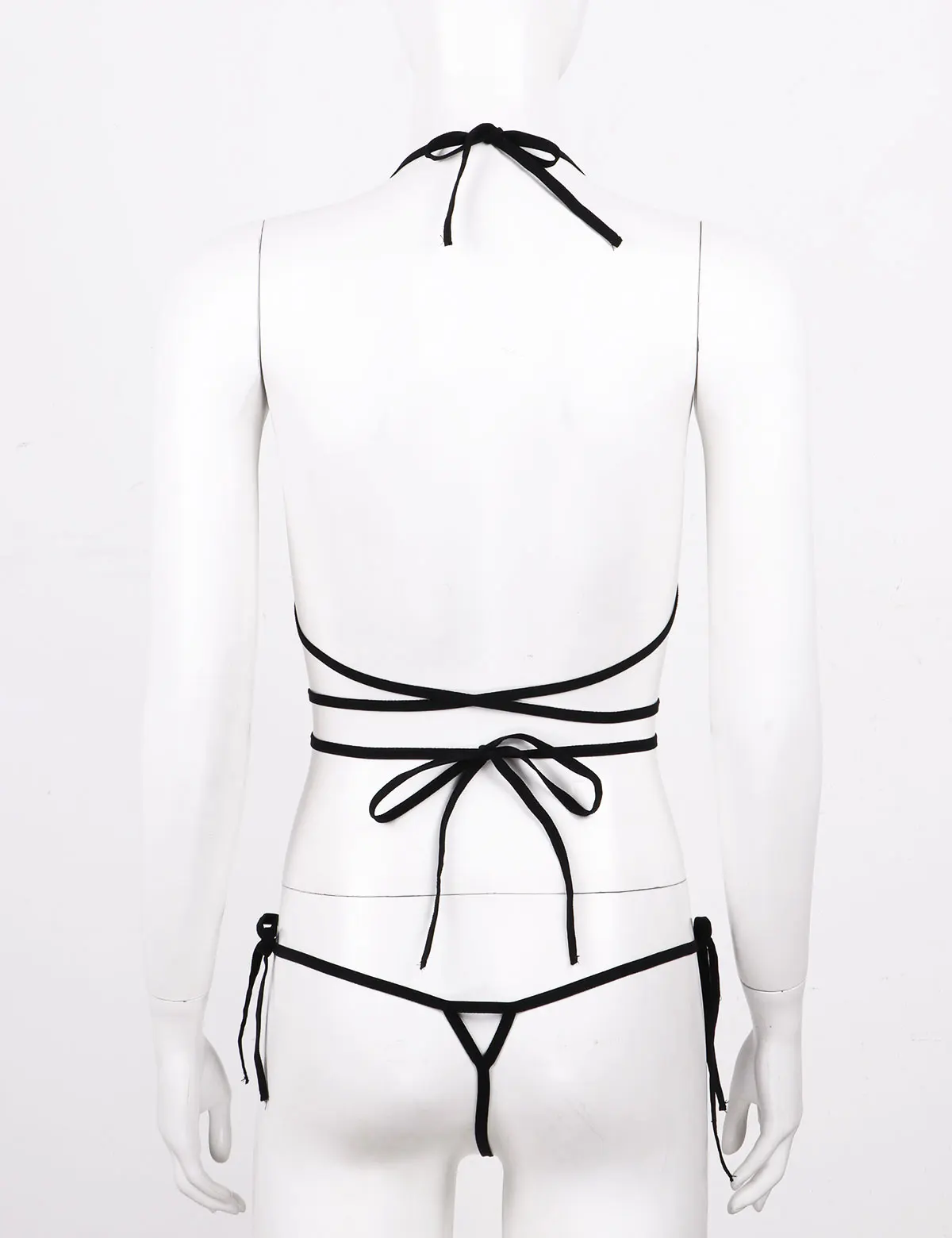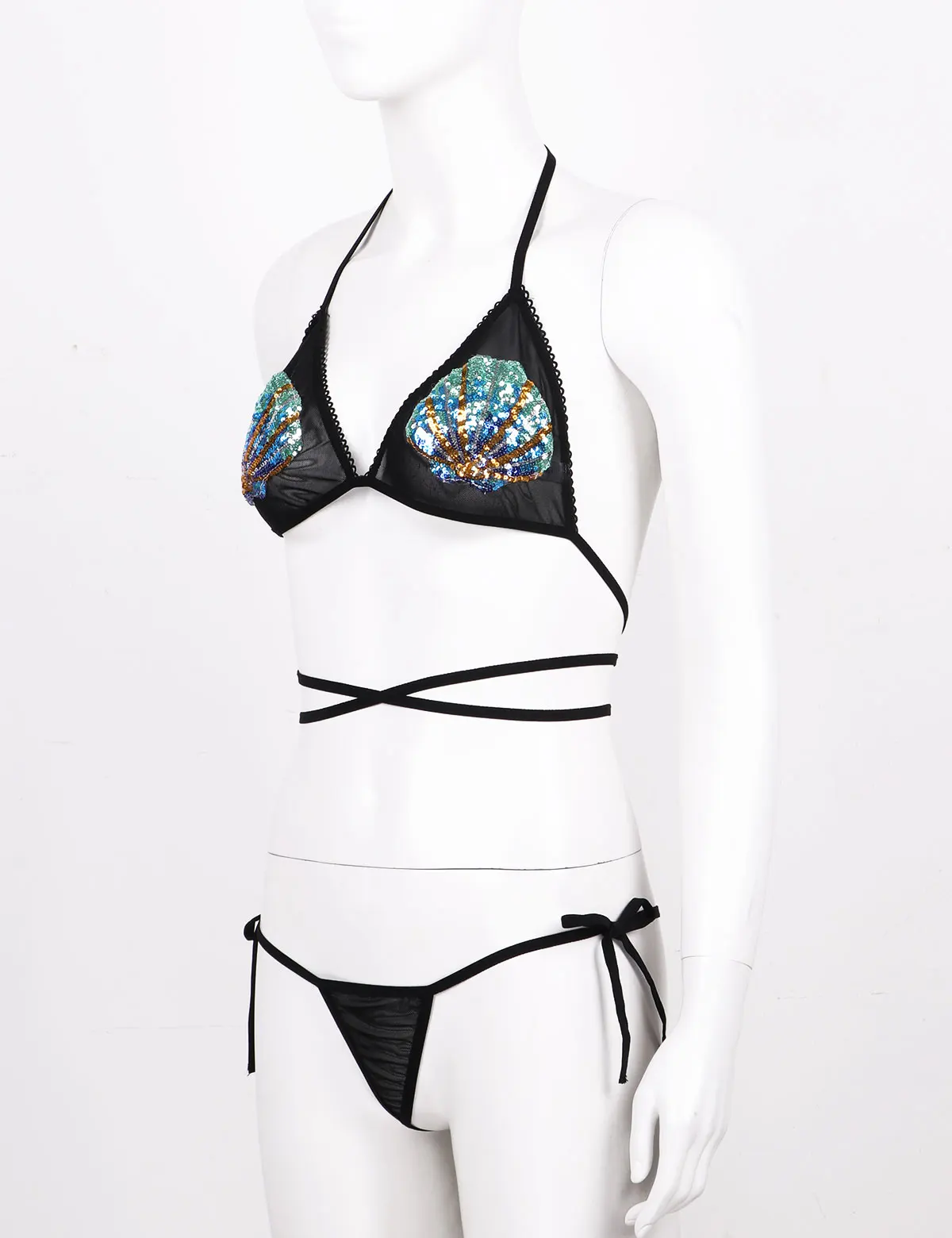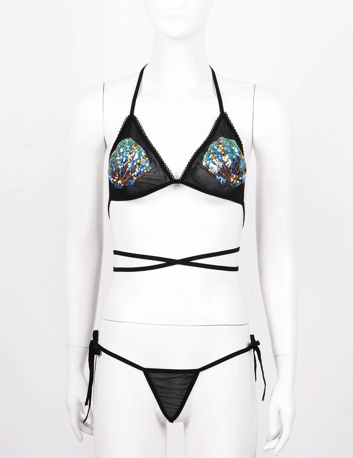 Топ бюстгальтера с лямкой на шее и глубоким v-образным вырезом спереди, блестящими пайетками и накладками на груди, с длинной лентой вокруг вашего тела и затягивающейся застежкой.