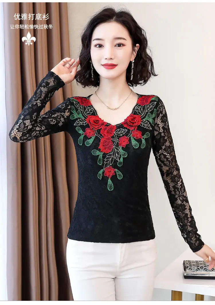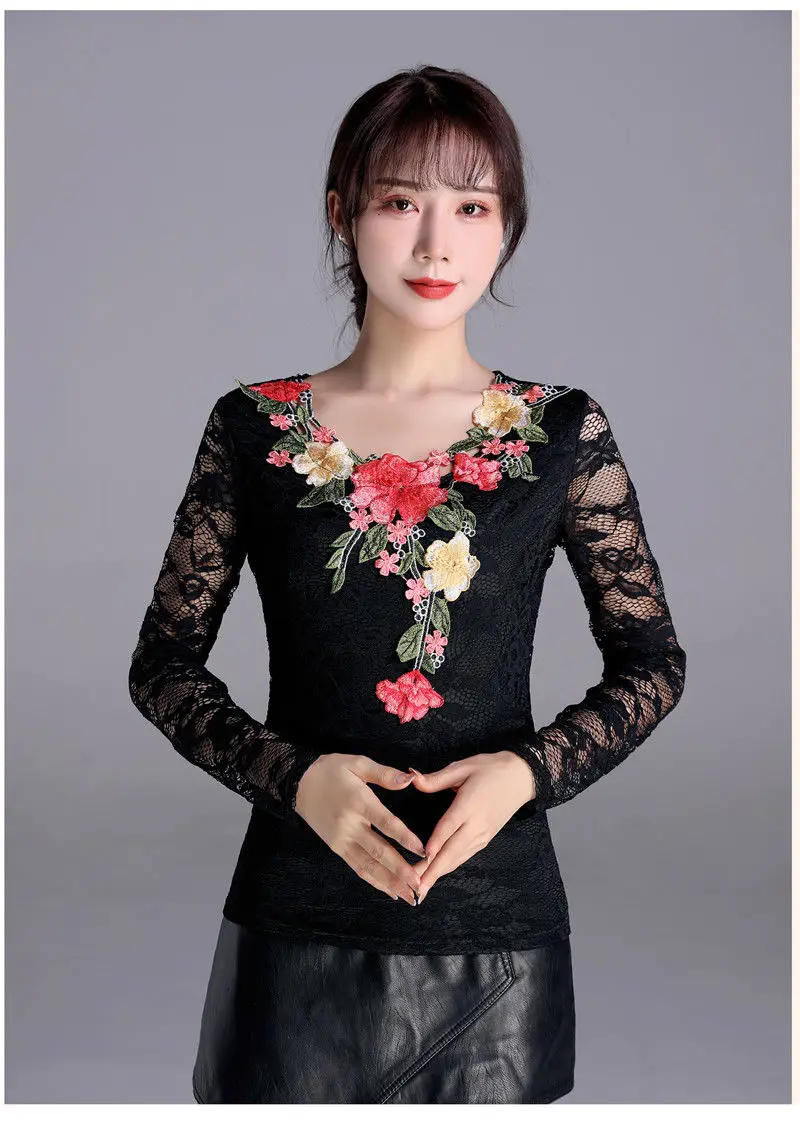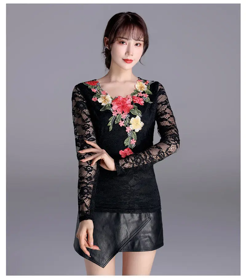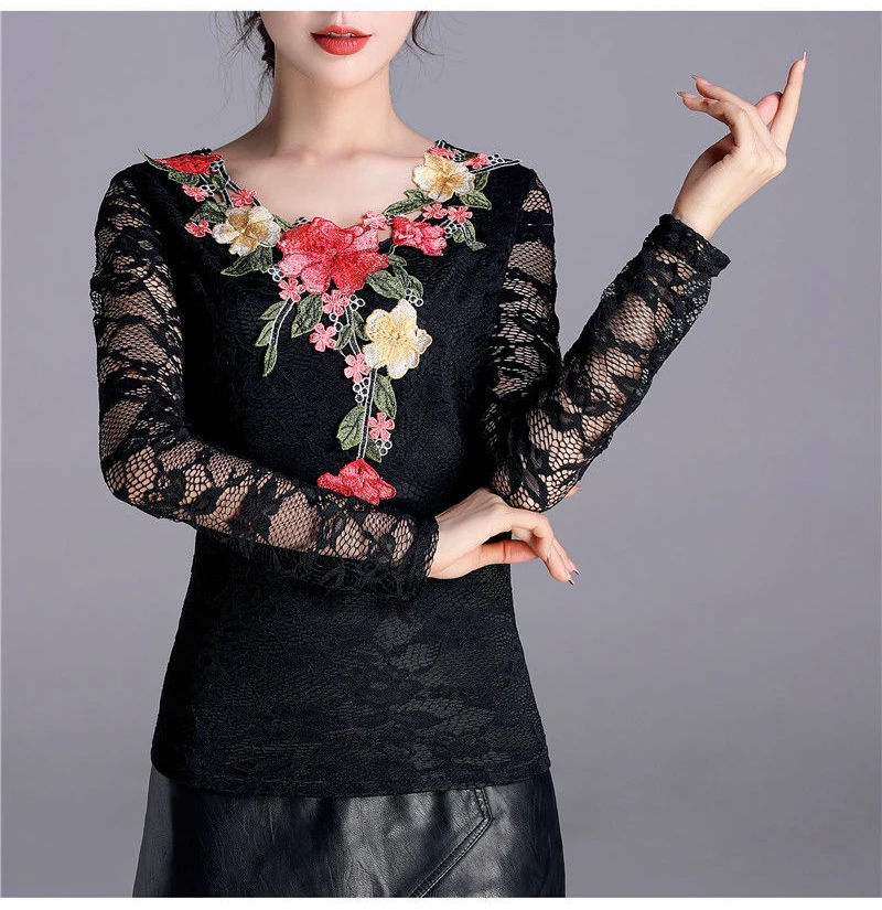 Черный Кружевной Топ Блузка с длинным рукавом Топ плюс размер женщин